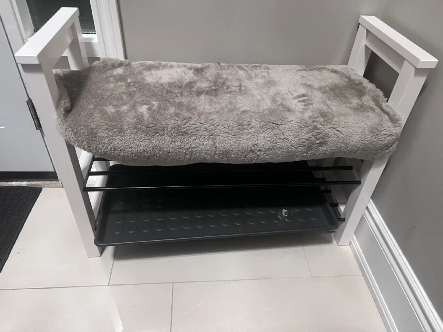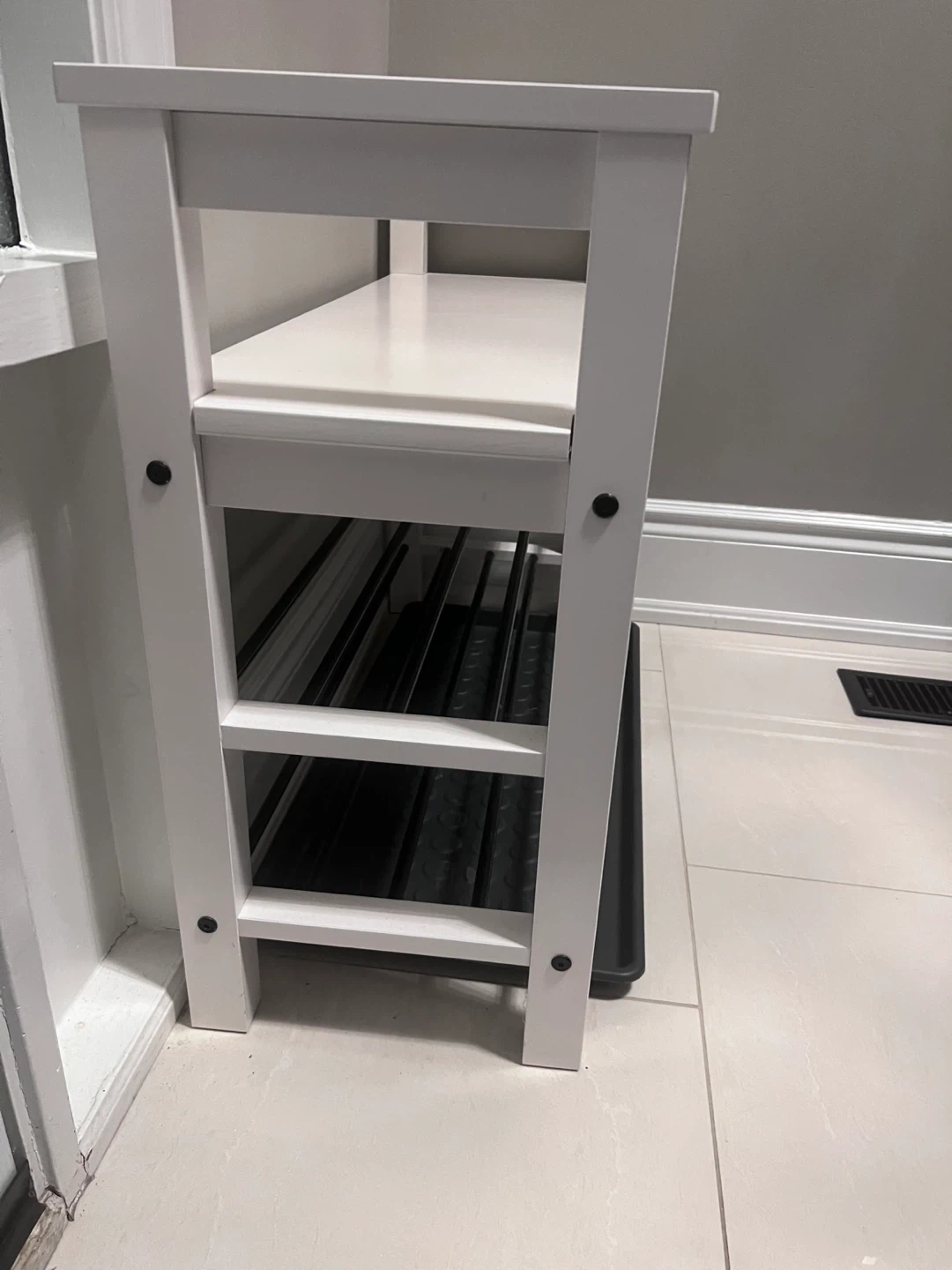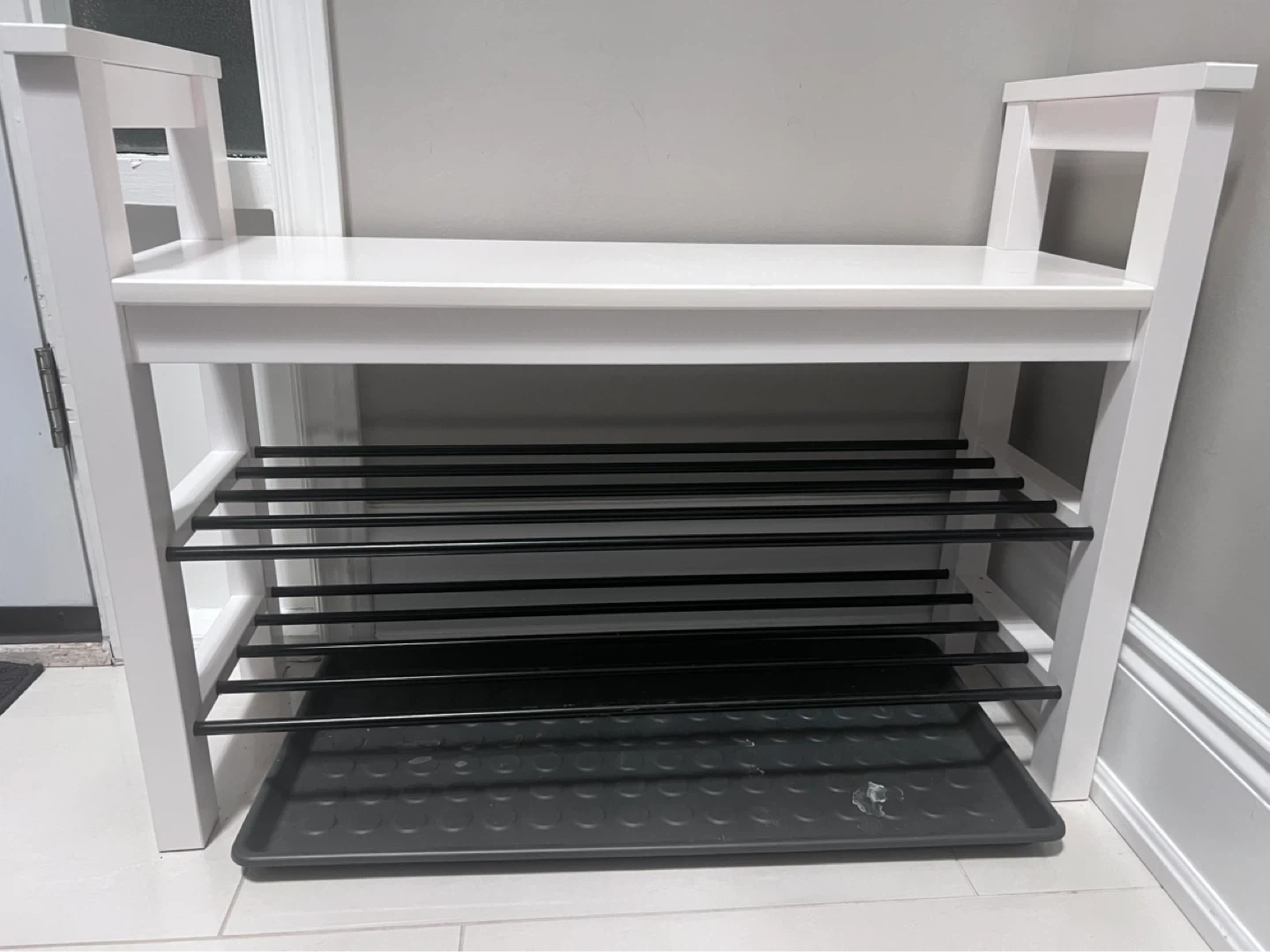 White shoe rack bench with two metal shelves and a removable plastic tray. The bench has a slatted top shelf for seating and two open shelves below for shoe storage. It's approximately 20 inches tall. Perfect for an entryway!