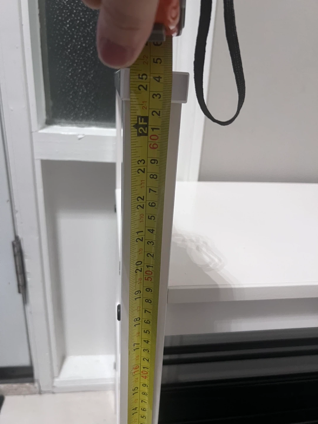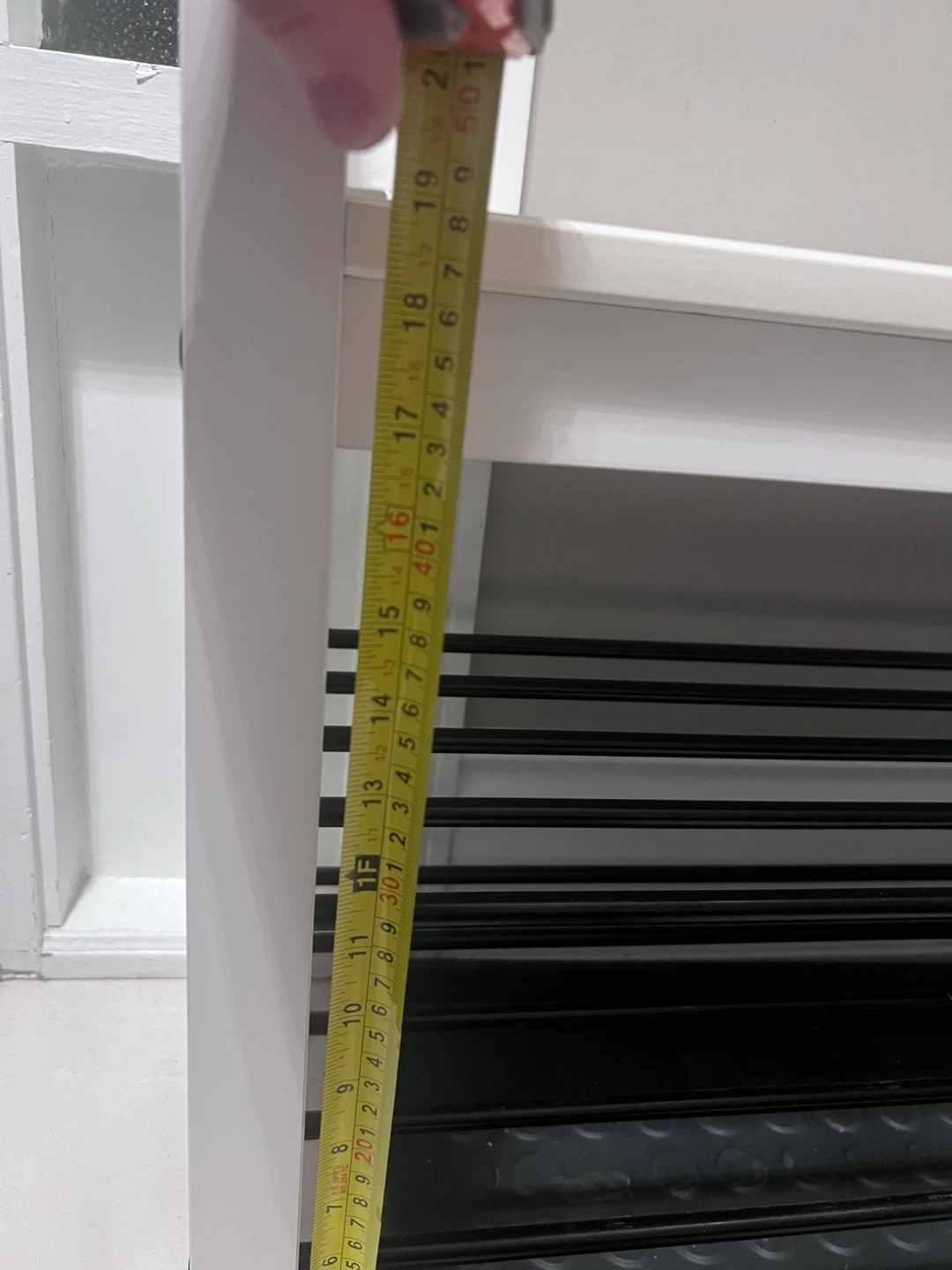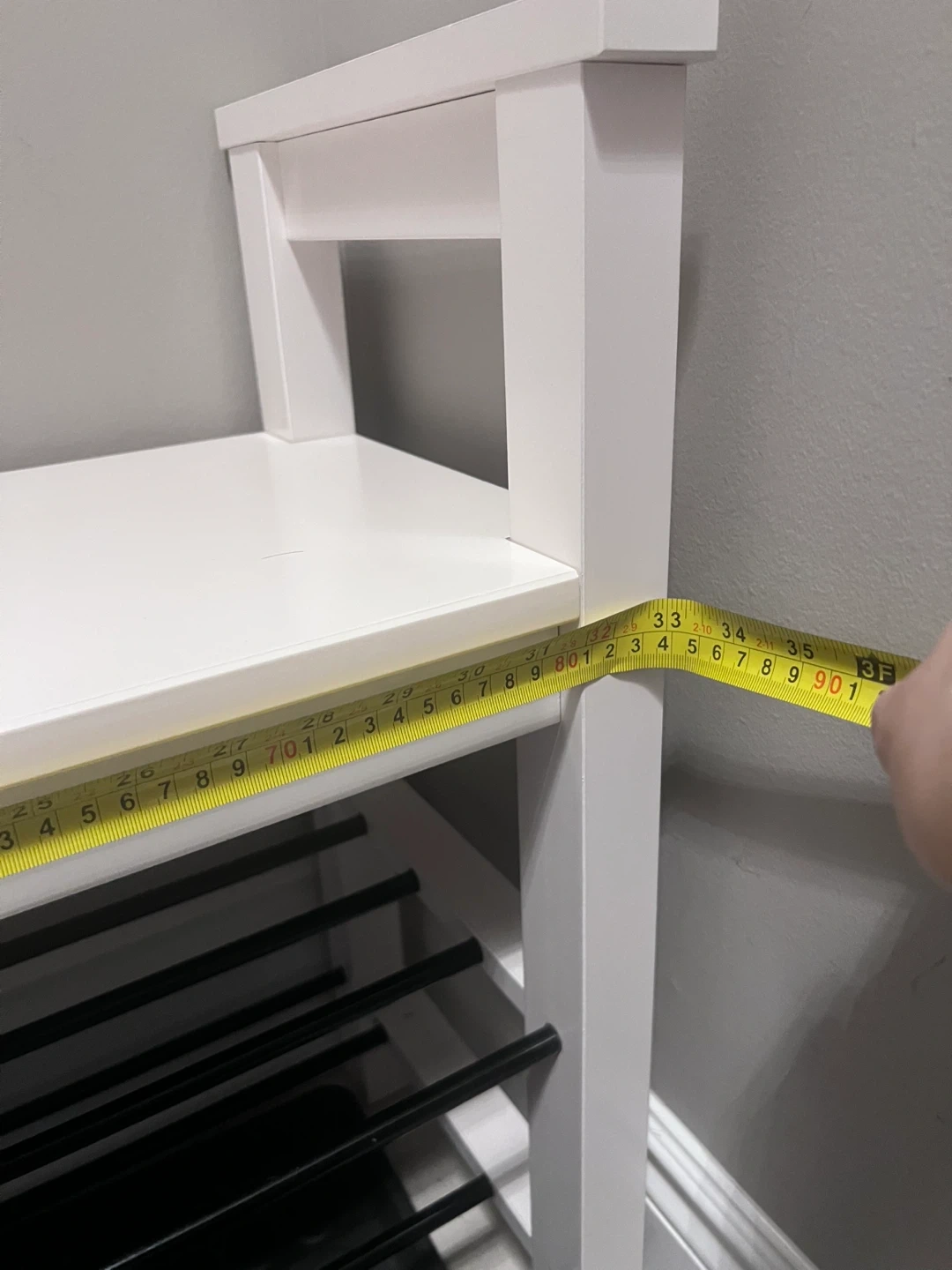 White shoe rack bench with two metal shelves and a removable plastic tray. The bench has a slatted top shelf for seating and two open shelves below for shoe storage. It's approximately 20 inches tall. Perfect for an entryway!