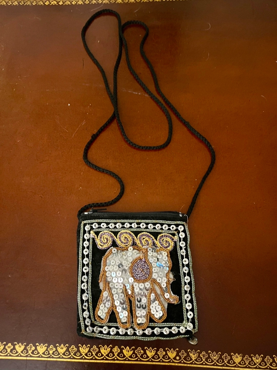 Cute little black shoulder bag with an elephant design made of sequins and beads. It has a zipper closure and a thin black strap. Perfect for carrying small items!
