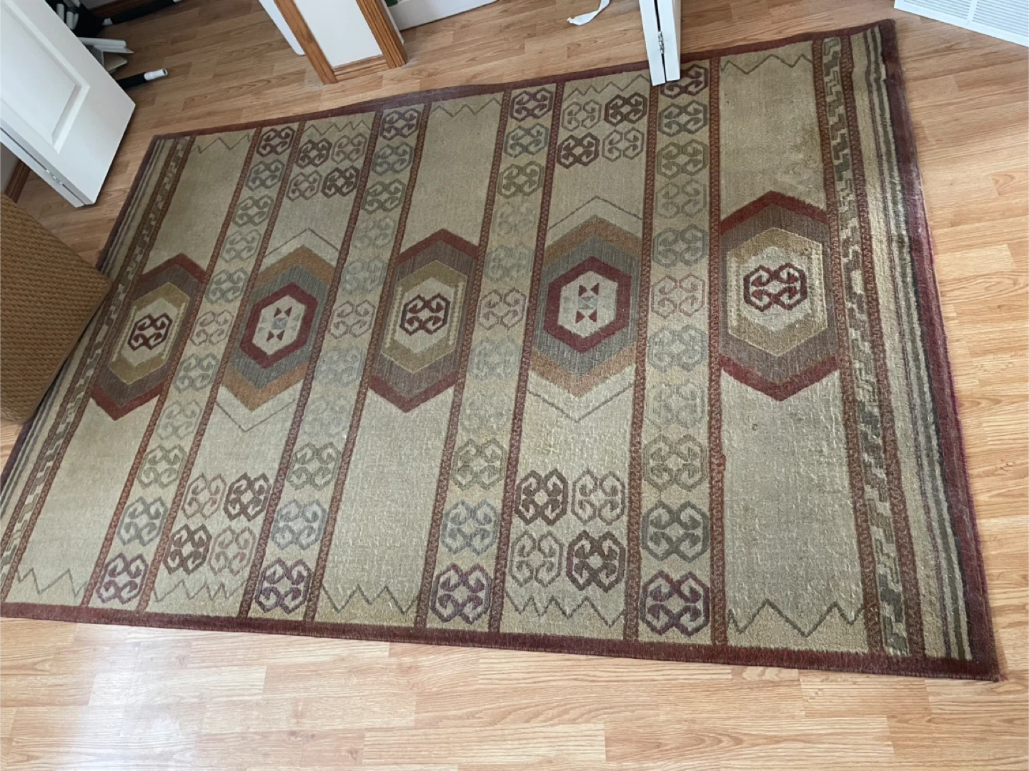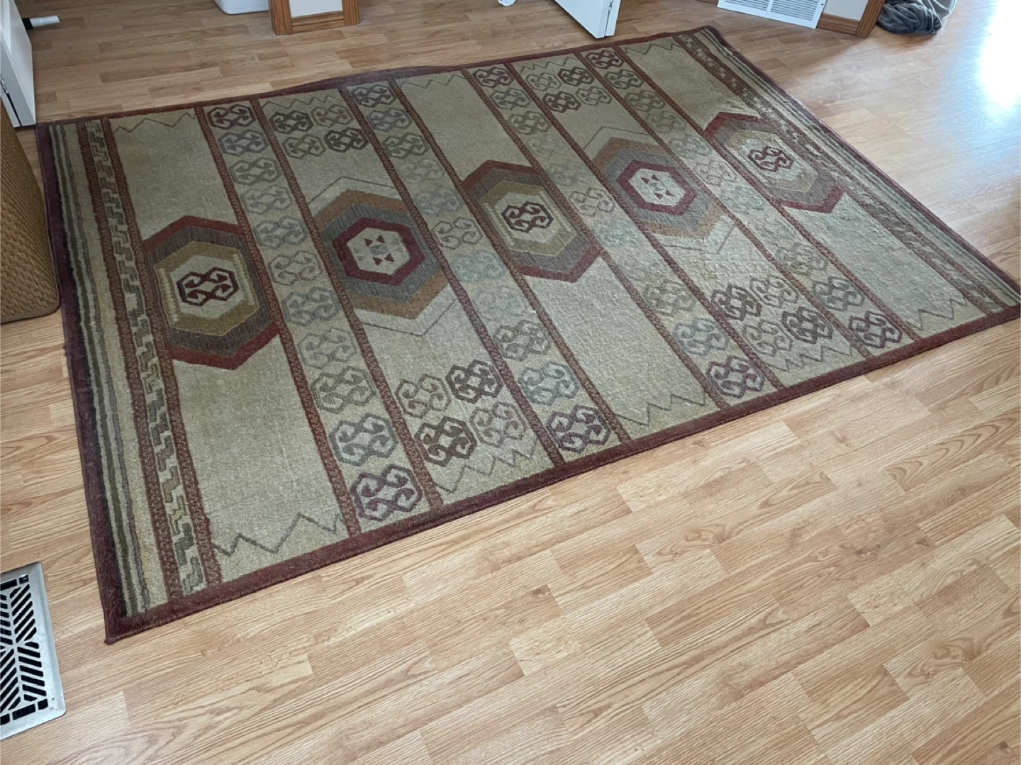 This area rug features a cream and brown geometric design. It adds a warm, traditional touch to any room. The durable material is suitable for high-traffic areas. Comes from a pet loved home.
