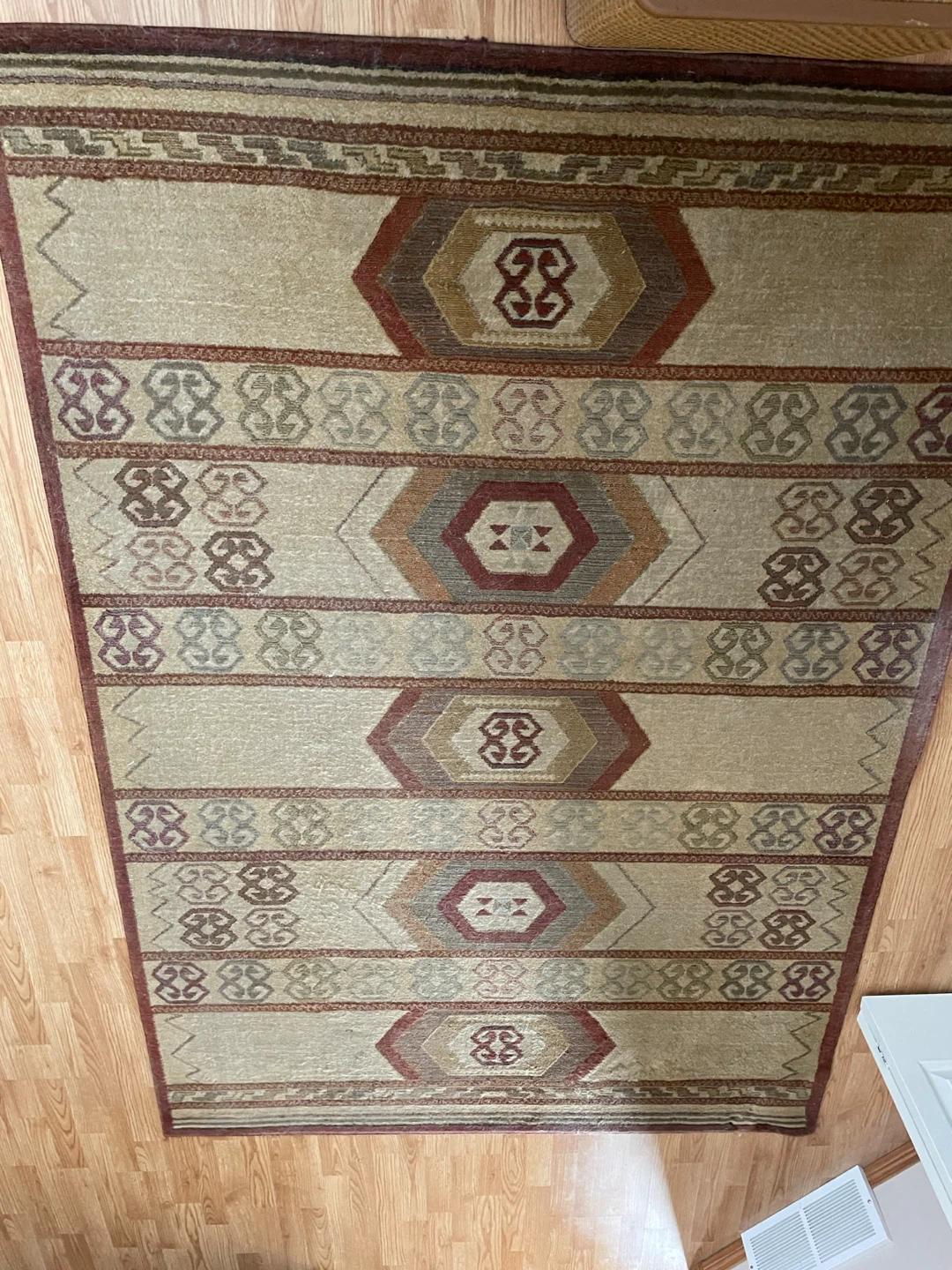 This area rug features a cream and brown geometric design. It adds a warm, traditional touch to any room. The durable material is suitable for high-traffic areas. Comes from a pet loved home.