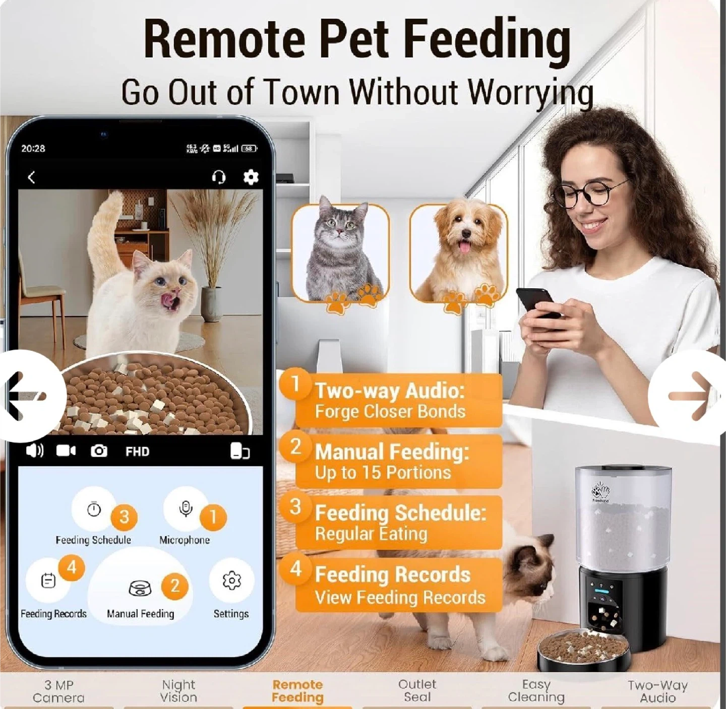 This smart pet feeder features a 3MP camera with night vision and ultra-wide angle. It allows for remote feeding with up to 15 portions and has two-way audio. It also offers a feeding schedule and records feeding activities.