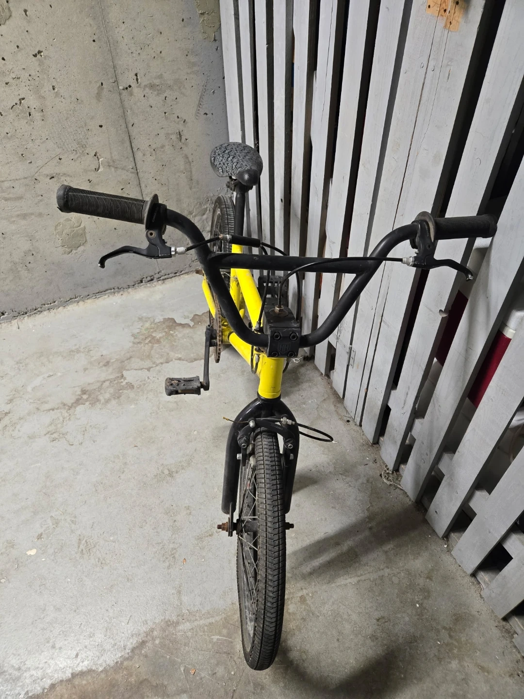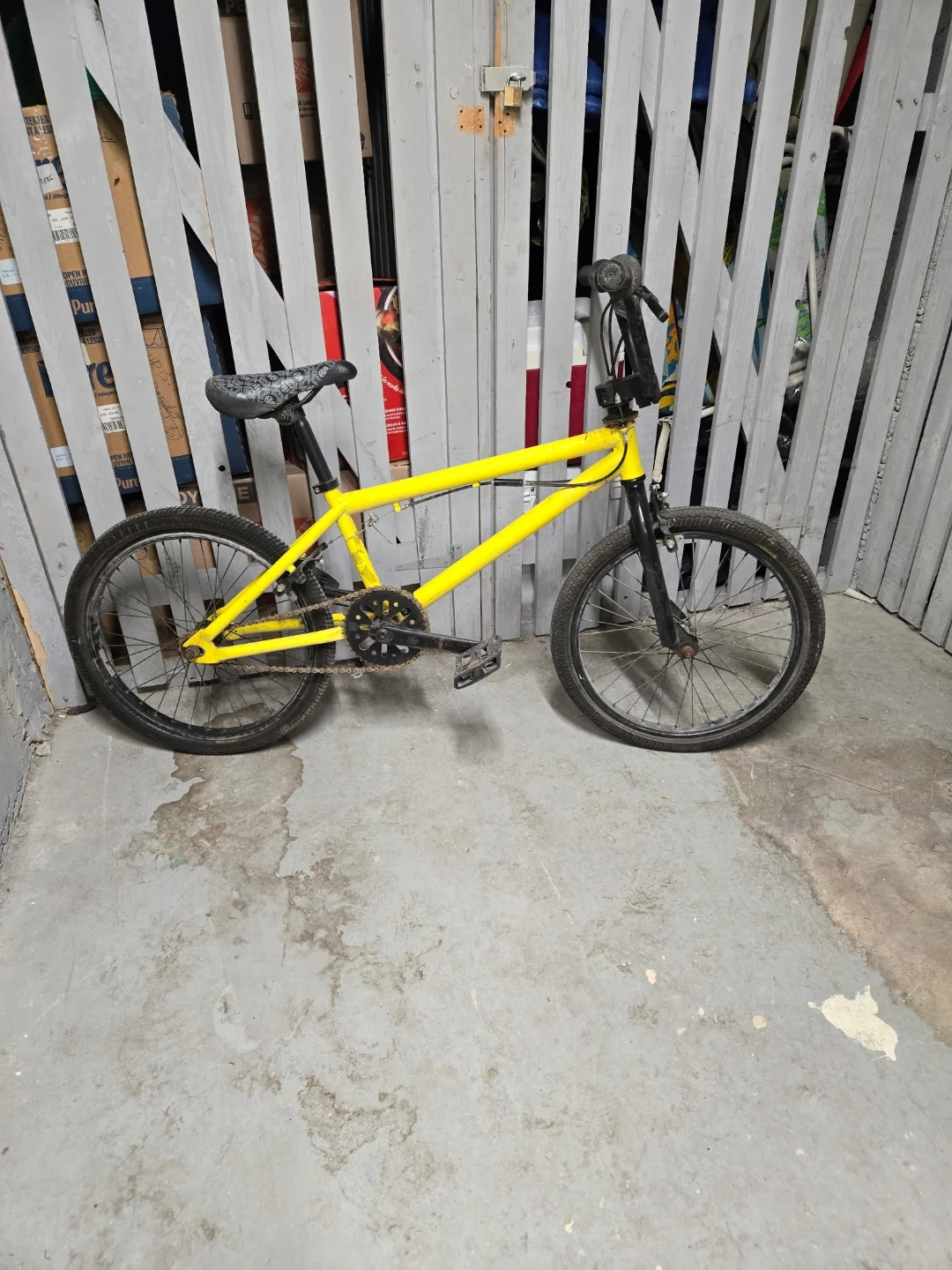 A bright yellow BMX bike. It features a standard frame with black handlebars and seat. The tires look like they're ready for some action!