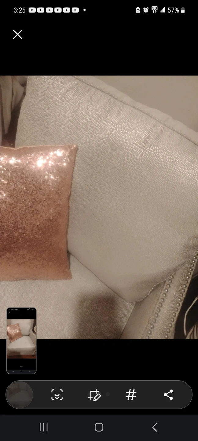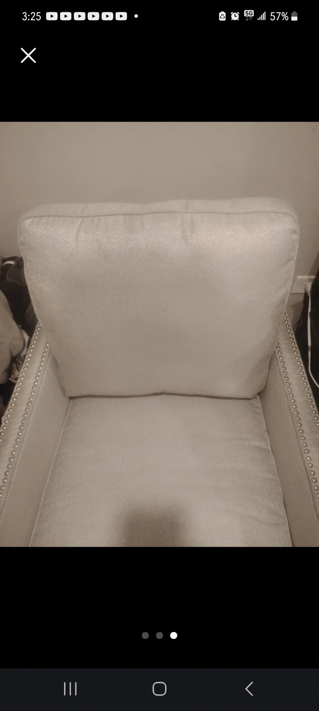 This is a single white accent chair. It features studded detailing along the arms. Sad to see it go but it's time make an offer