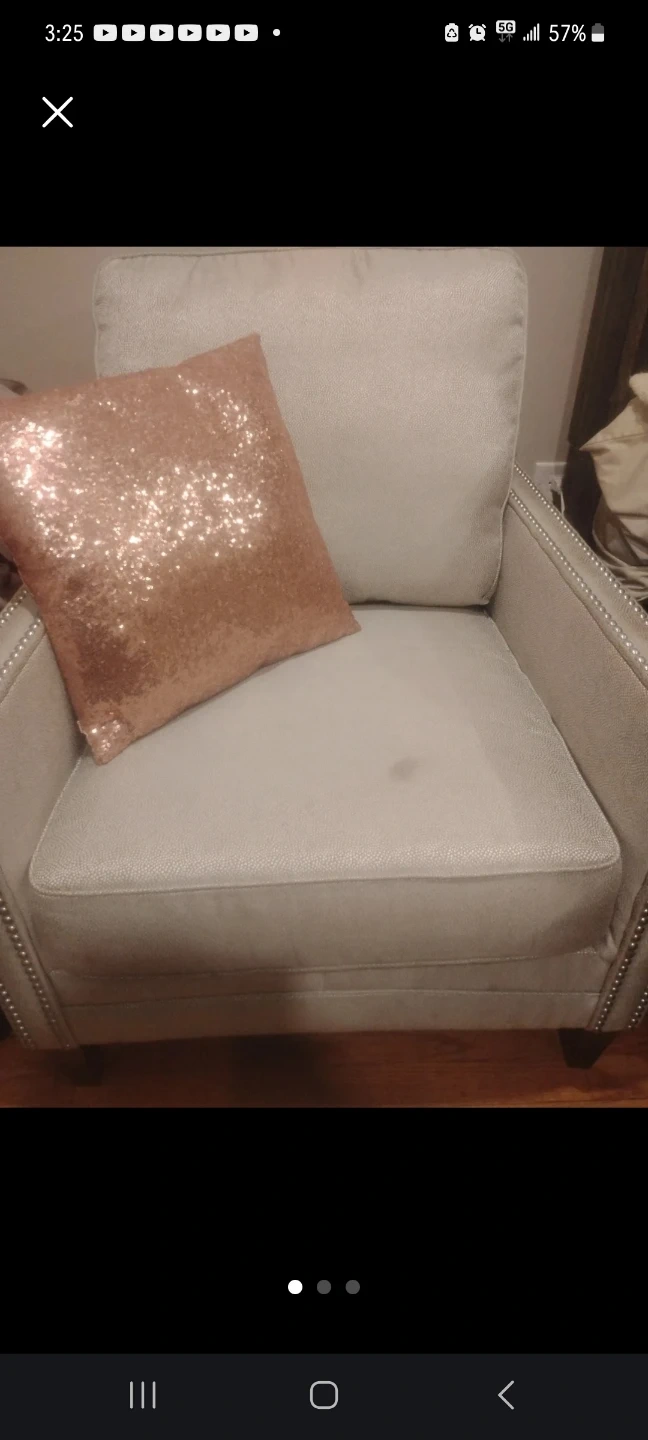 This is a single white accent chair. It features studded detailing along the arms. Sad to see it go but it's time make an offer