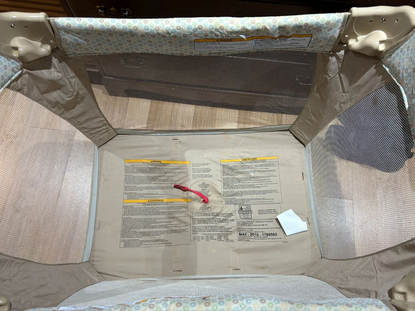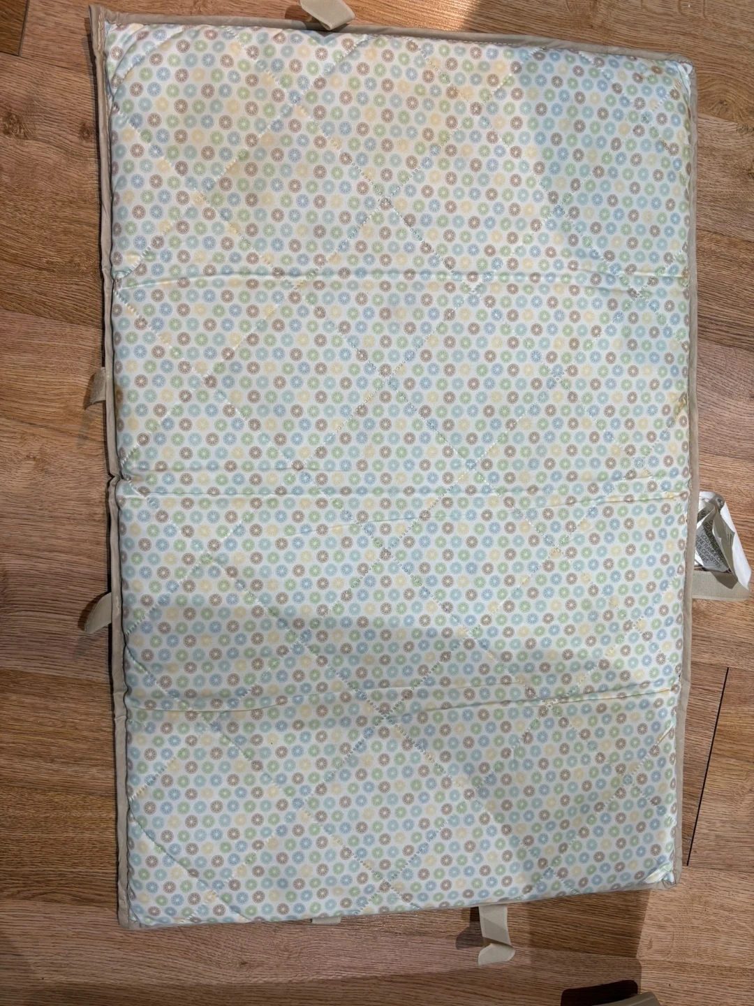 Graco Pack 'n Play Playard in beige with a patterned mattress pad. It's easy to fold up for storage and transport. This playard is great for travel or for use at home. Pick up Mississauga Area or Brampton Area. Length is 32 inches, width is 22.5 inches and height is 32.5 inches