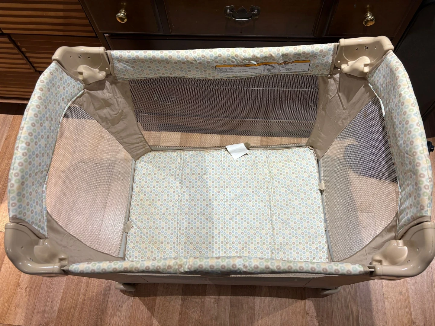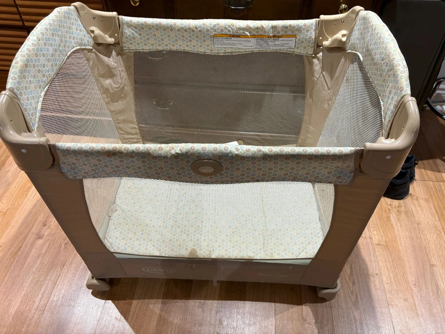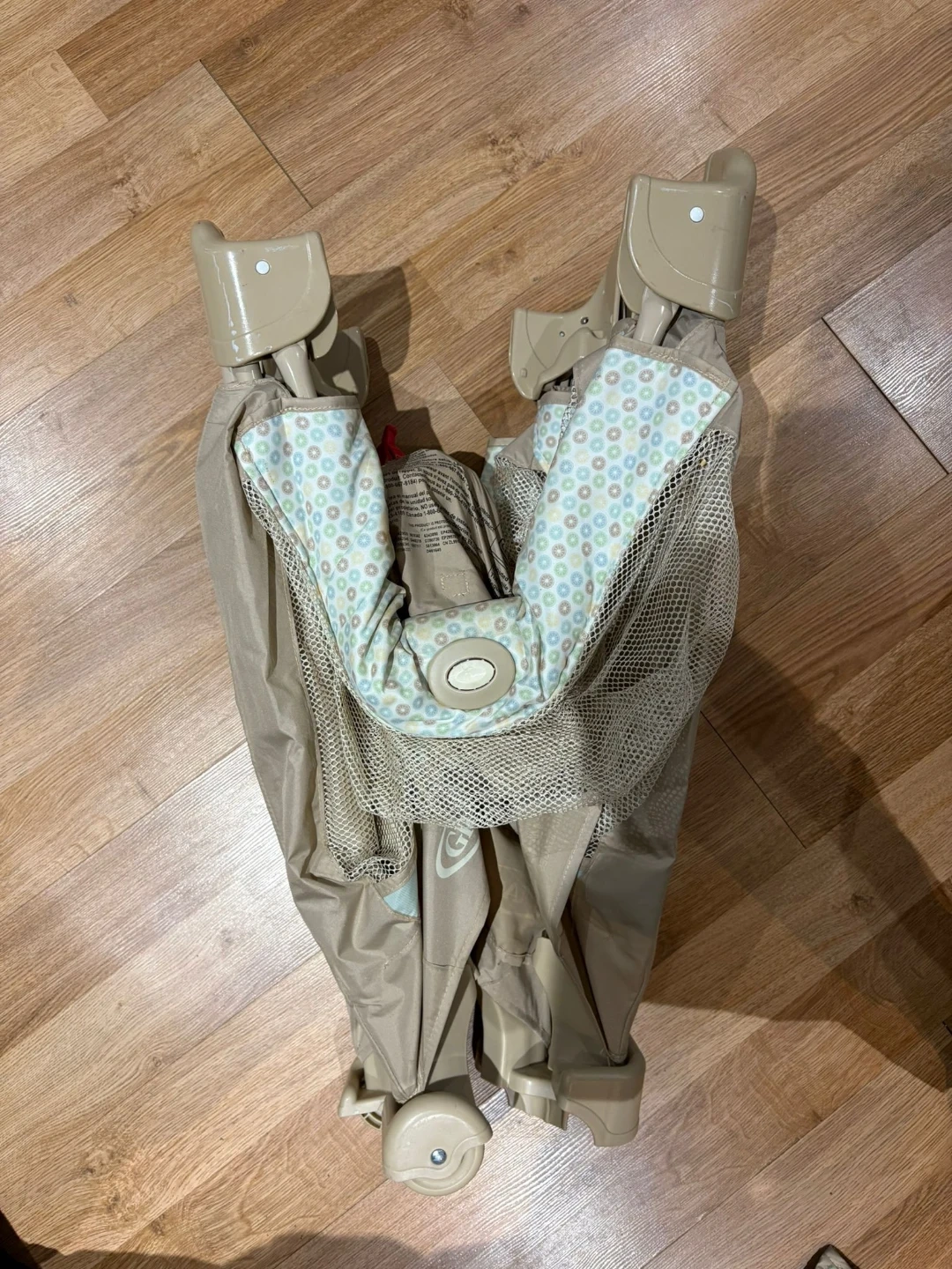 Graco Pack 'n Play Playard in beige with a patterned mattress pad. It's easy to fold up for storage and transport. This playard is great for travel or for use at home. Pick up Mississauga Area or Brampton Area. Length is 32 inches, width is 22.5 inches and height is 32.5 inches