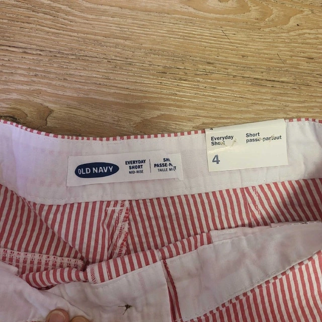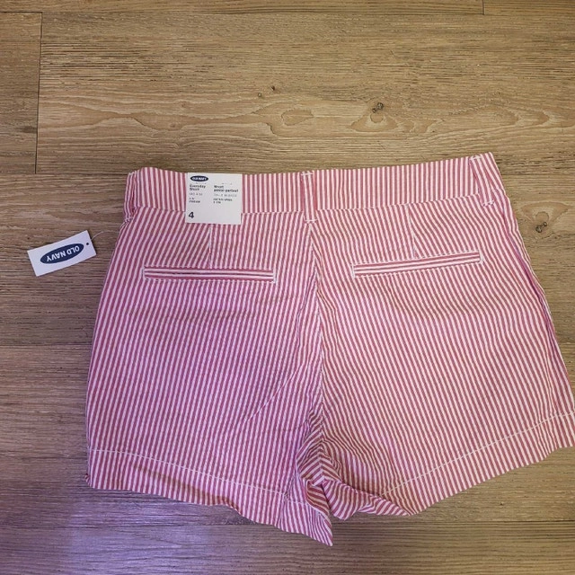 These are a pair of brand new Old Navy shorts, perfect for everyday wear! They feature a stylish red and white striped pattern and a comfortable fit. The shorts are size 4 with a 3.5 inch inseam, making them a versatile addition to your wardrobe.