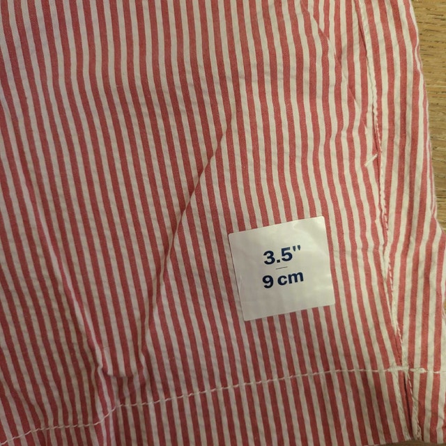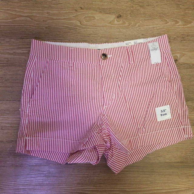 These are a pair of brand new Old Navy shorts, perfect for everyday wear! They feature a stylish red and white striped pattern and a comfortable fit. The shorts are size 4 with a 3.5 inch inseam, making them a versatile addition to your wardrobe.