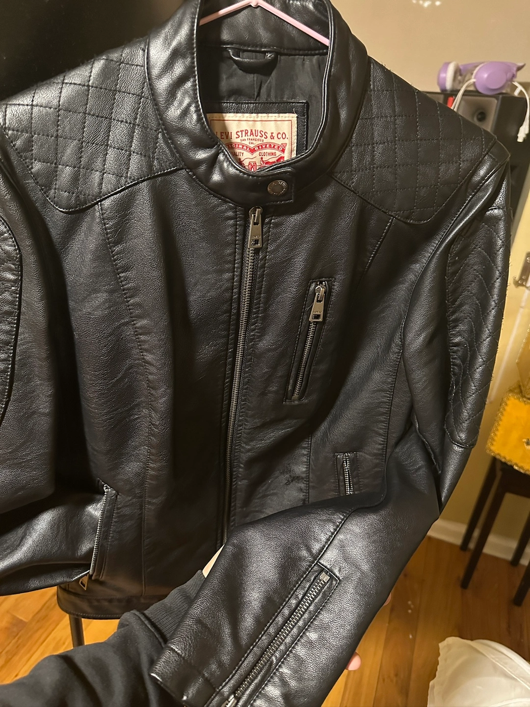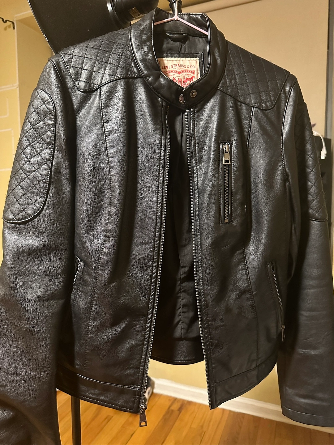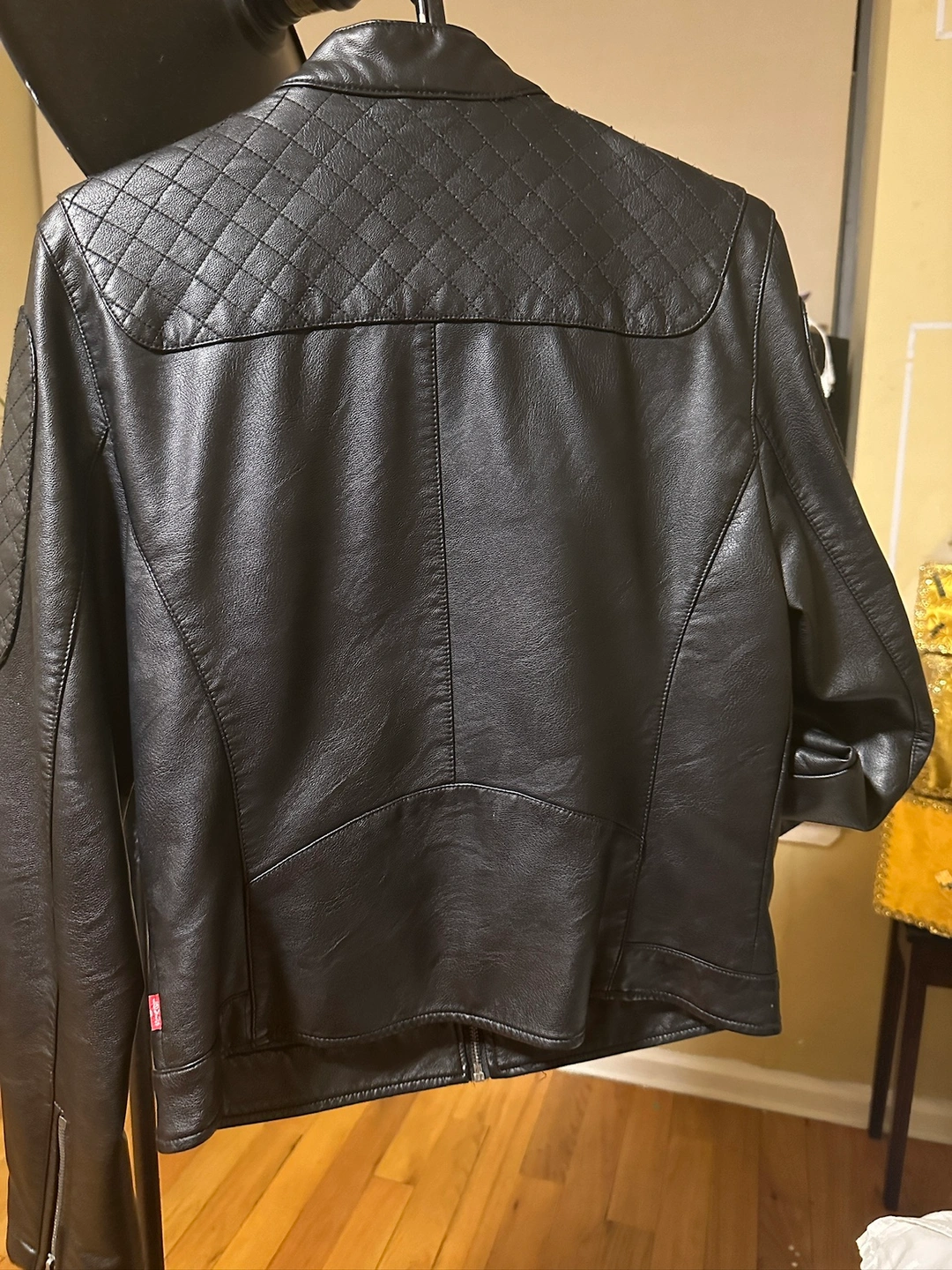 A black leather jacket with a zipper closure. It features quilted accents on the shoulders and back. It has two zippered pockets on the front and one zippered pocket on the left sleeve. The jacket has a Levi's tag on the inside. The jacket has a size tag. The jacket is in good condition.