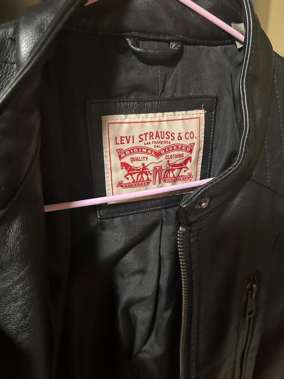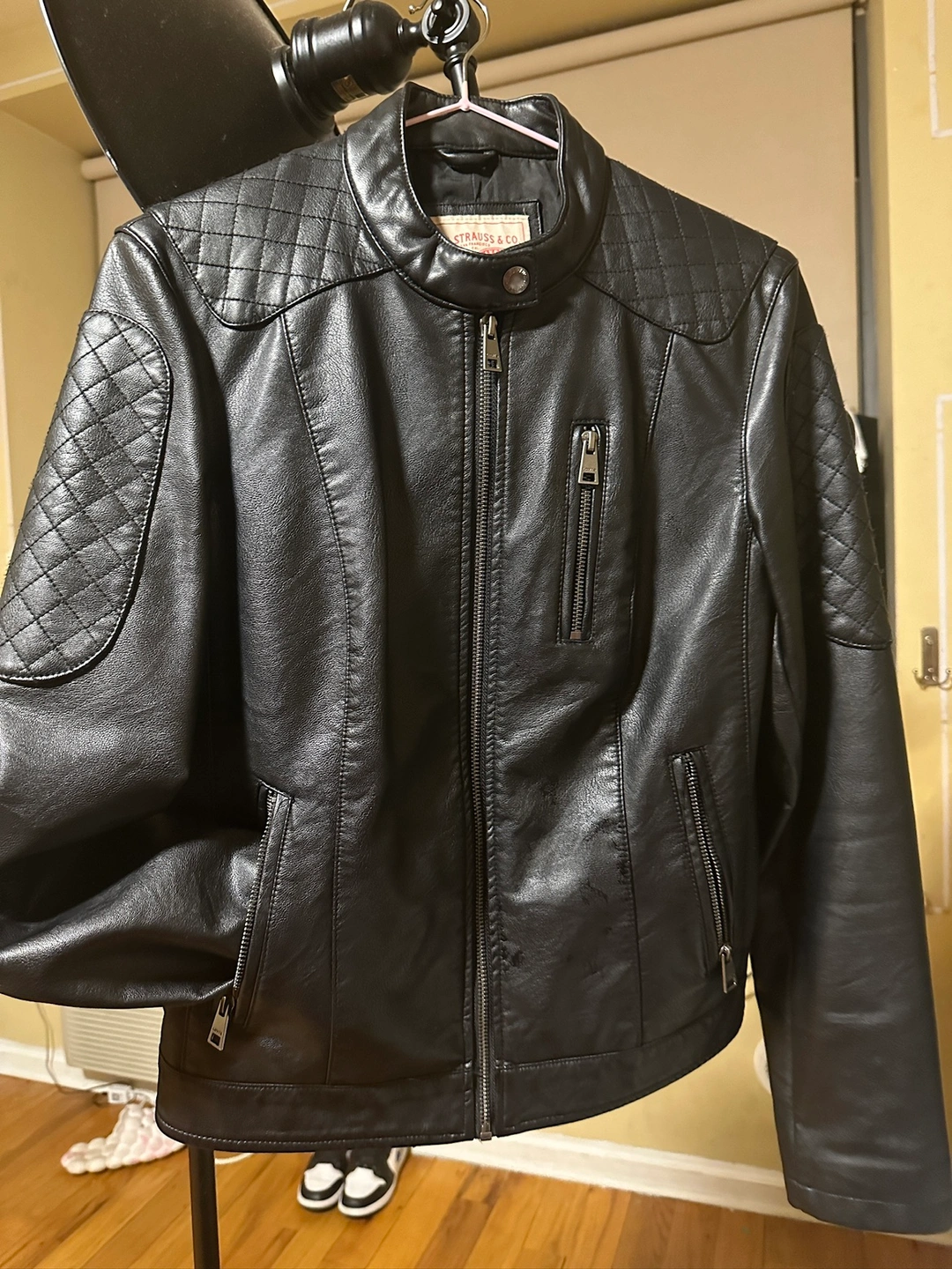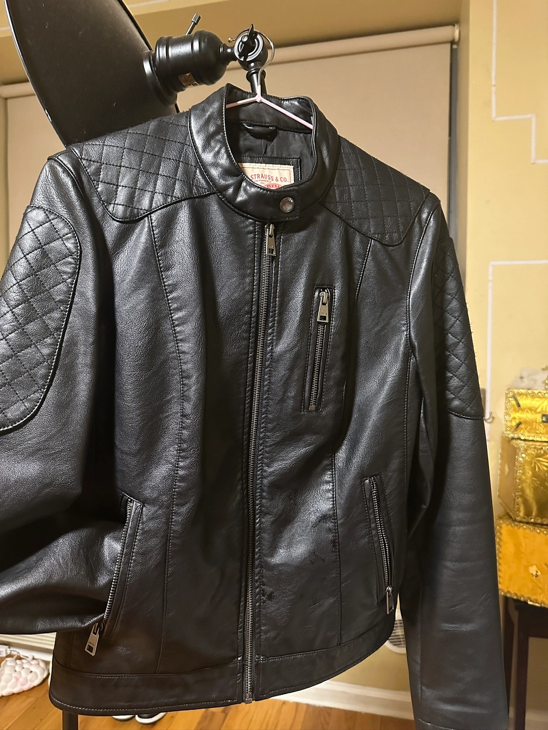 A black leather jacket with a zipper closure. It features quilted accents on the shoulders and back. It has two zippered pockets on the front and one zippered pocket on the left sleeve. The jacket has a Levi's tag on the inside. The jacket has a size tag. The jacket is in good condition.