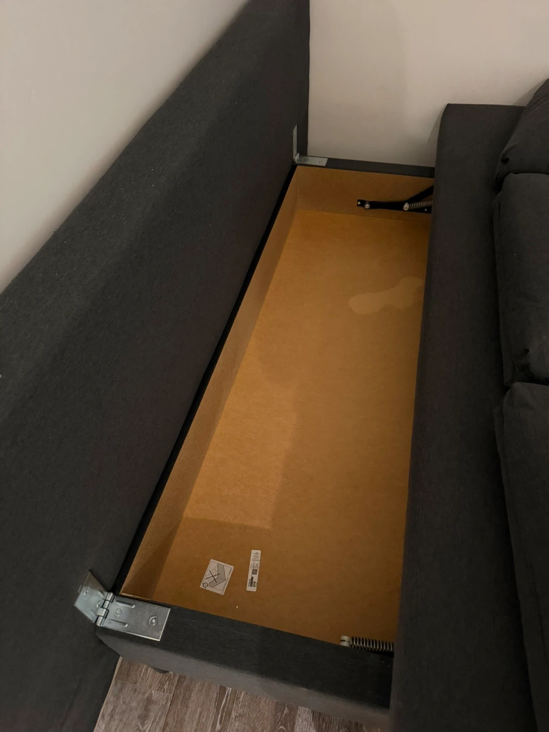 • Note: there is a small water stain/discoloration inside the storage compartment from a spilled glass of water; this is only cosmetic and does not affect use.