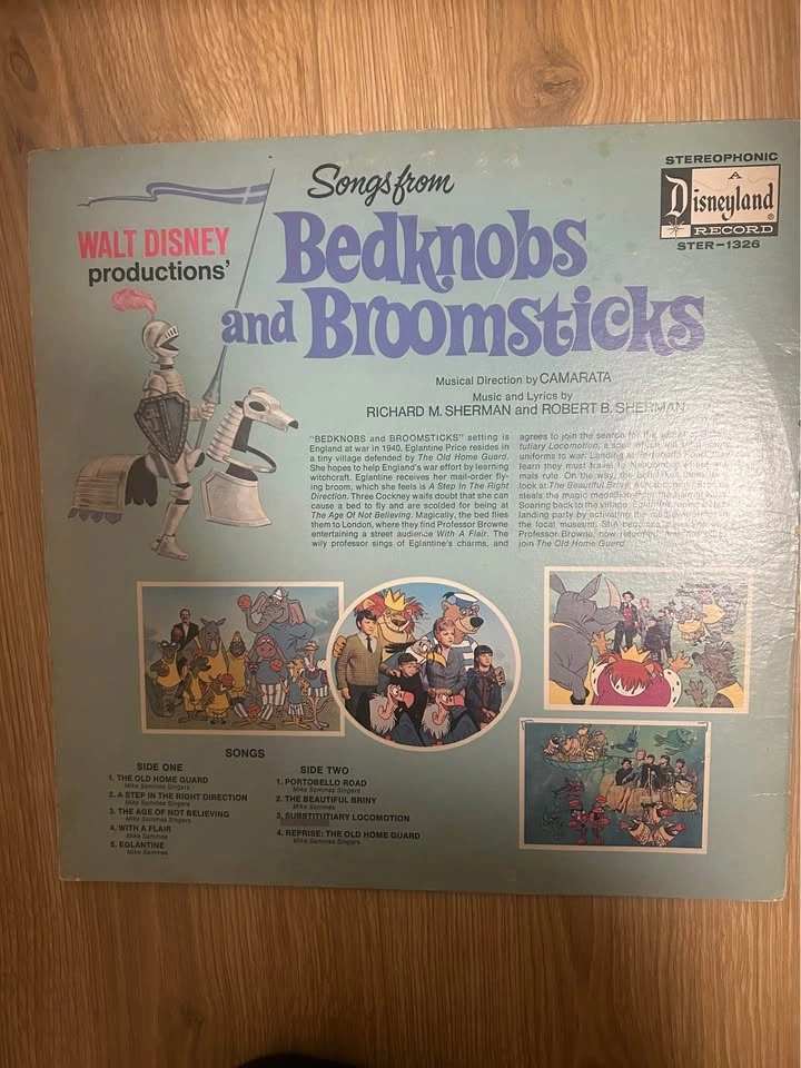 Vintage Disney vinyl record with songs from Bedknobs and Broomsticks. Includes hits like 'The Old Home Guard' and 'A Step in the Right Direction'. Record is in good condition with some signs of use on the cover. Comes with original sleeve and label.