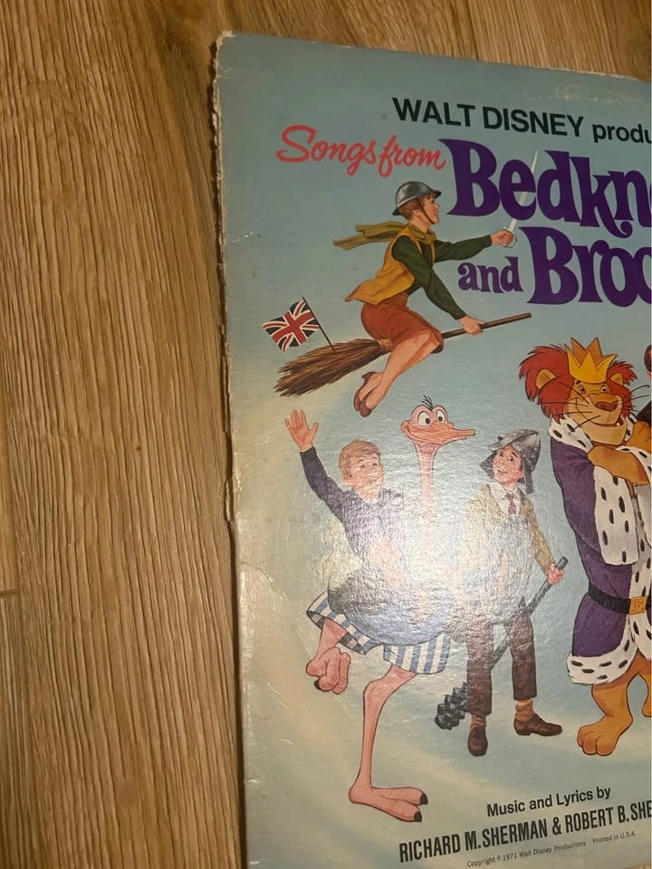 Vintage Disney vinyl record with songs from Bedknobs and Broomsticks. Includes hits like 'The Old Home Guard' and 'A Step in the Right Direction'. Record is in good condition with some signs of use on the cover. Comes with original sleeve and label.