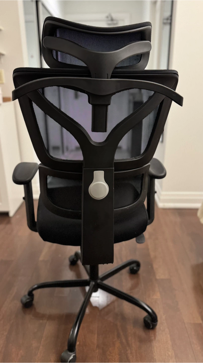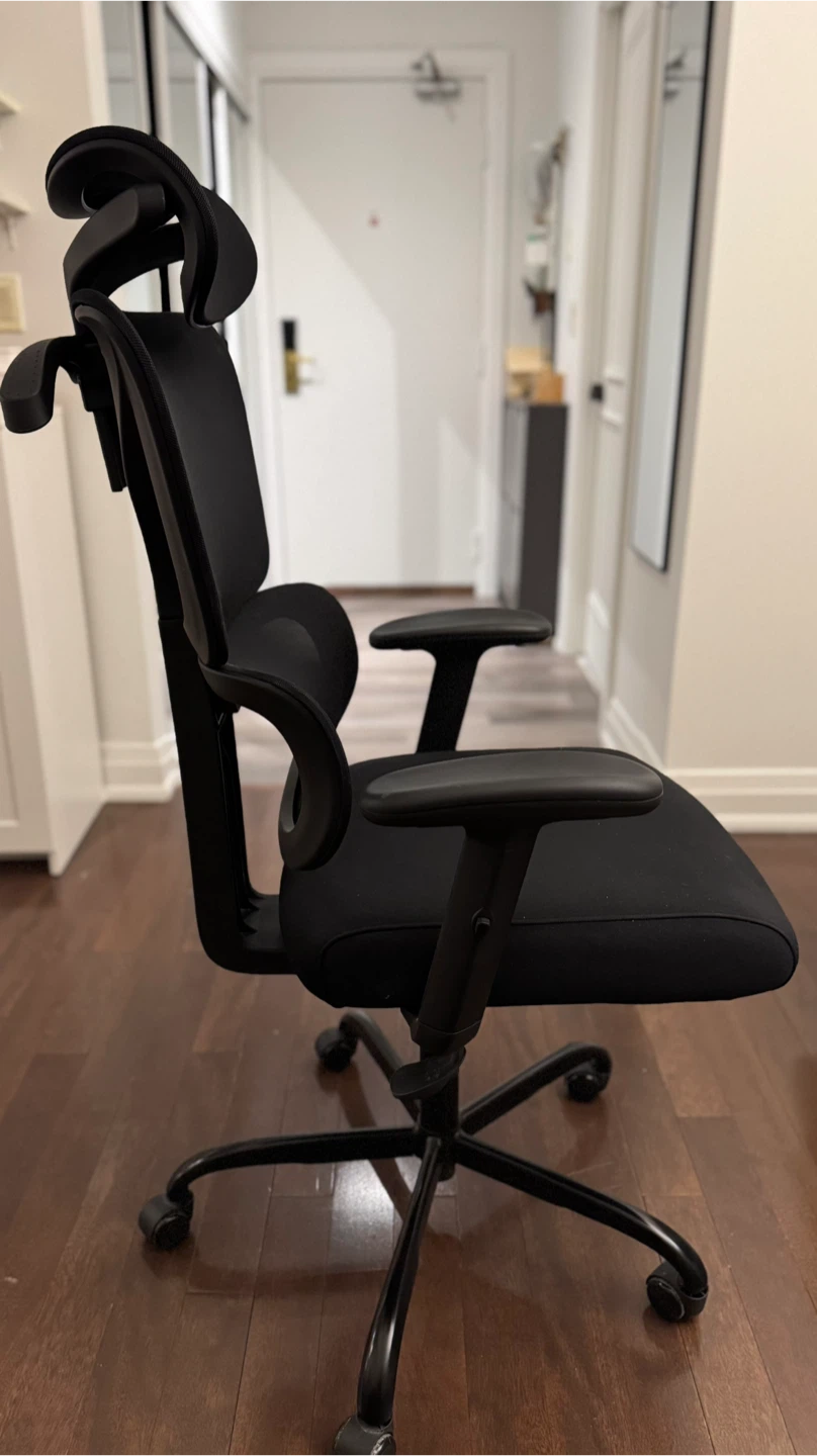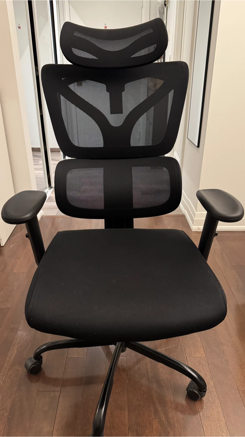 Selling a comfortable ergonomic office chair in great condition! It features a mesh back for breathability and good support, perfect for long hours at your desk. The chair is black and has adjustable armrests and headrest. It also has a sturdy base with smooth-rolling casters.