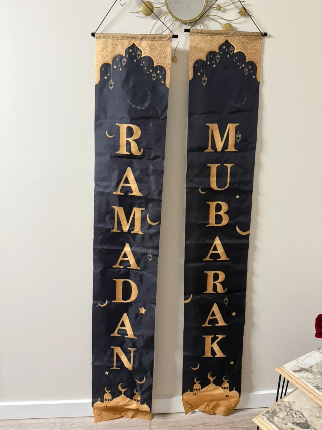 These are two black banners with gold lettering that read 'RAMADAN MUBARAK'. They're decorated with moons, stars, and mosque silhouettes. Perfect for celebrating Ramadan!