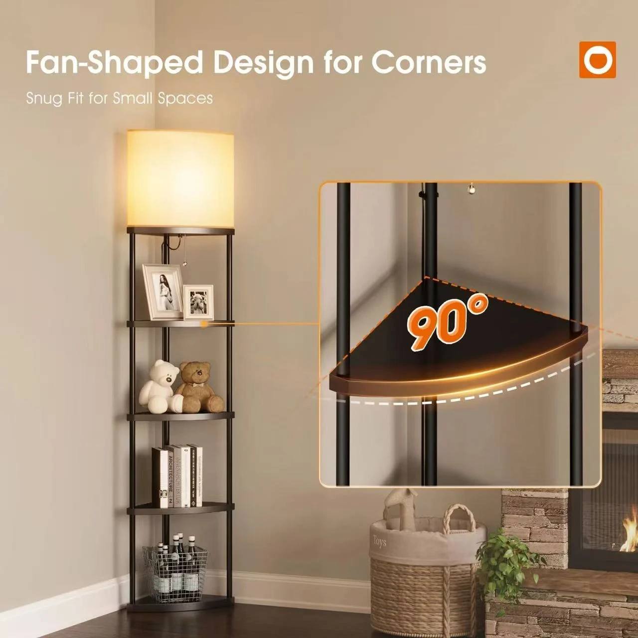This corner floor lamp features a fan-shaped design that fits snugly into small spaces. It offers three color temperatures: 3000K warm light, 4500K natural light, and 6000K daylight. The lamp includes multiple shelves for storage and display.
