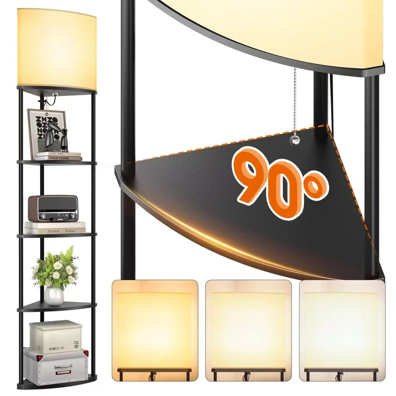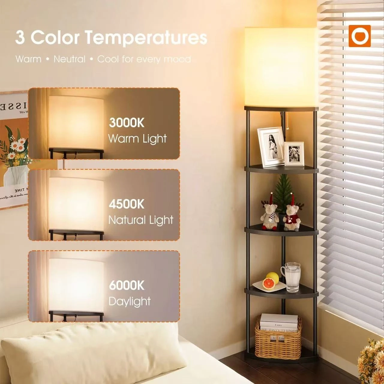 This corner floor lamp features a fan-shaped design that fits snugly into small spaces. It offers three color temperatures: 3000K warm light, 4500K natural light, and 6000K daylight. The lamp includes multiple shelves for storage and display.