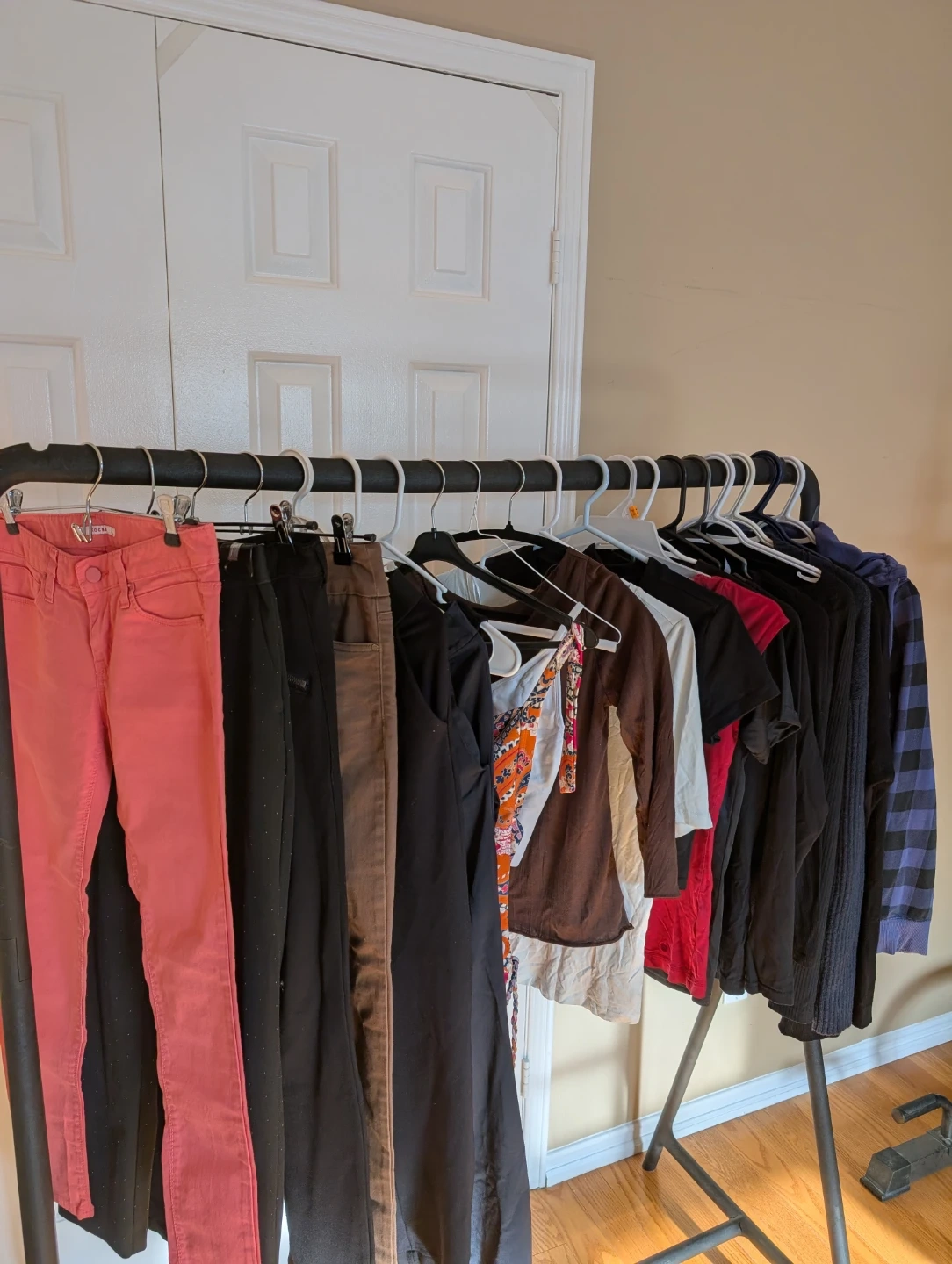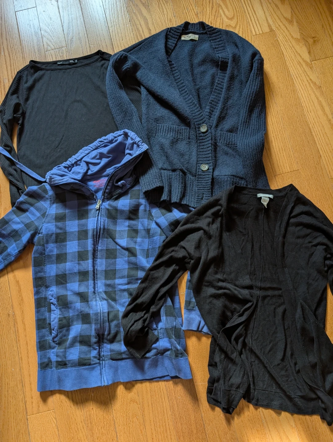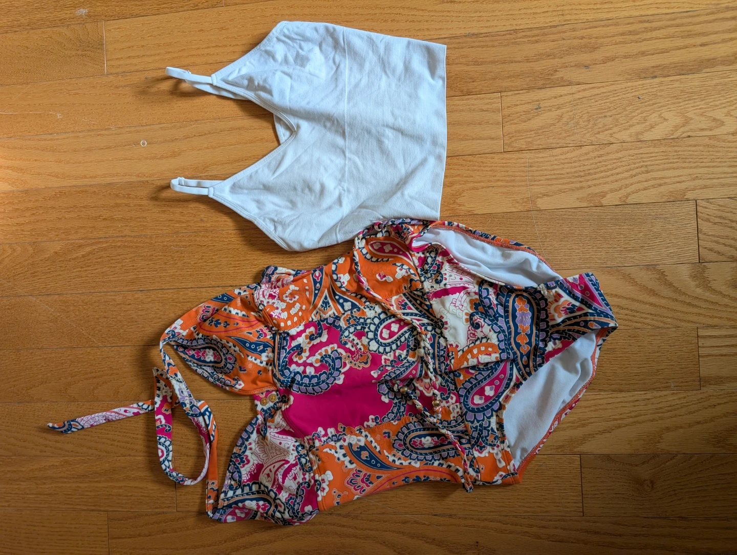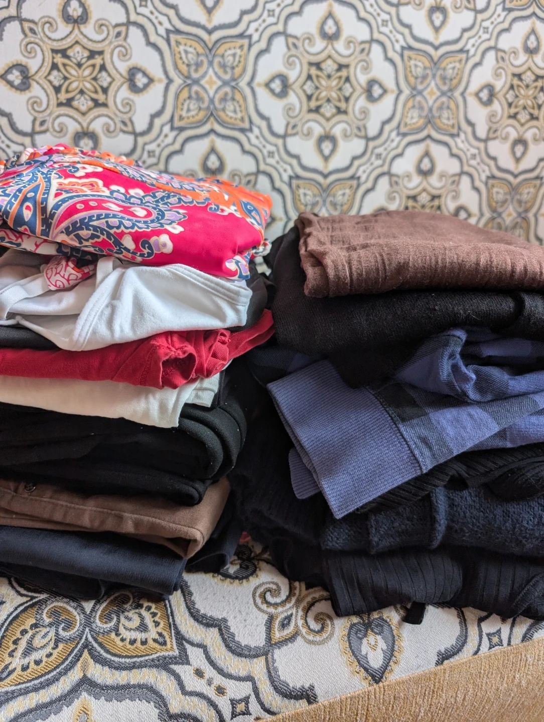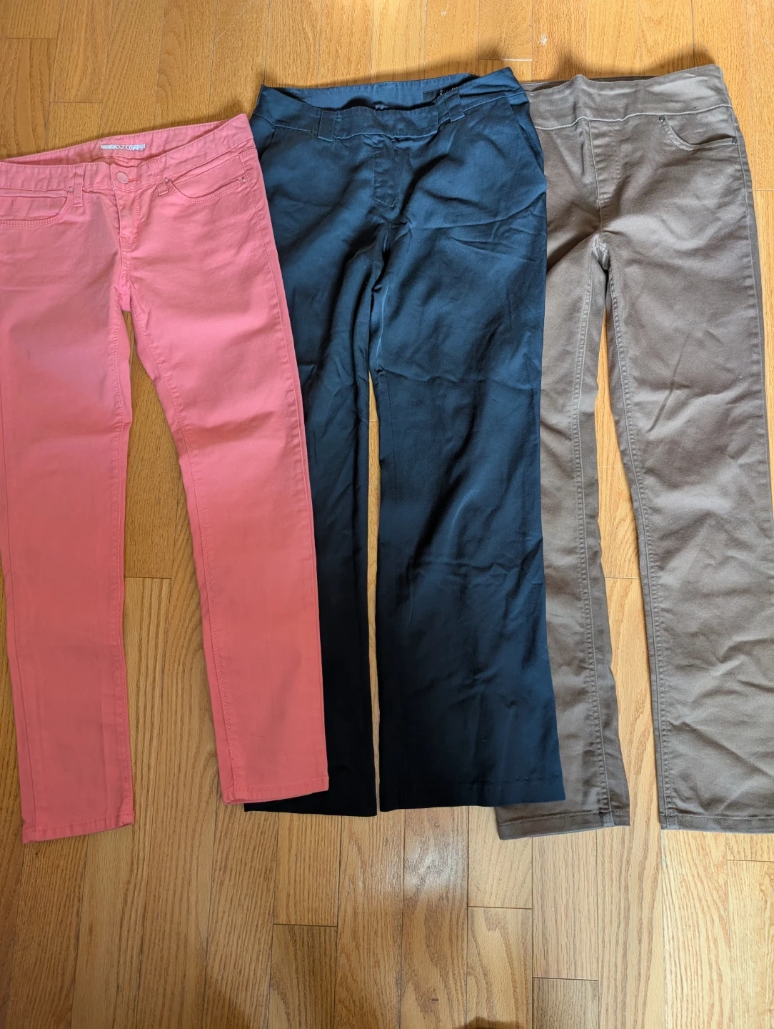 This bundle includes a variety of women's pants and tops in different colours and styles, along with a swimsuit. All items are in good or excellent condition. The price is for the whole bundle, which makes it 50 cents per item 😊