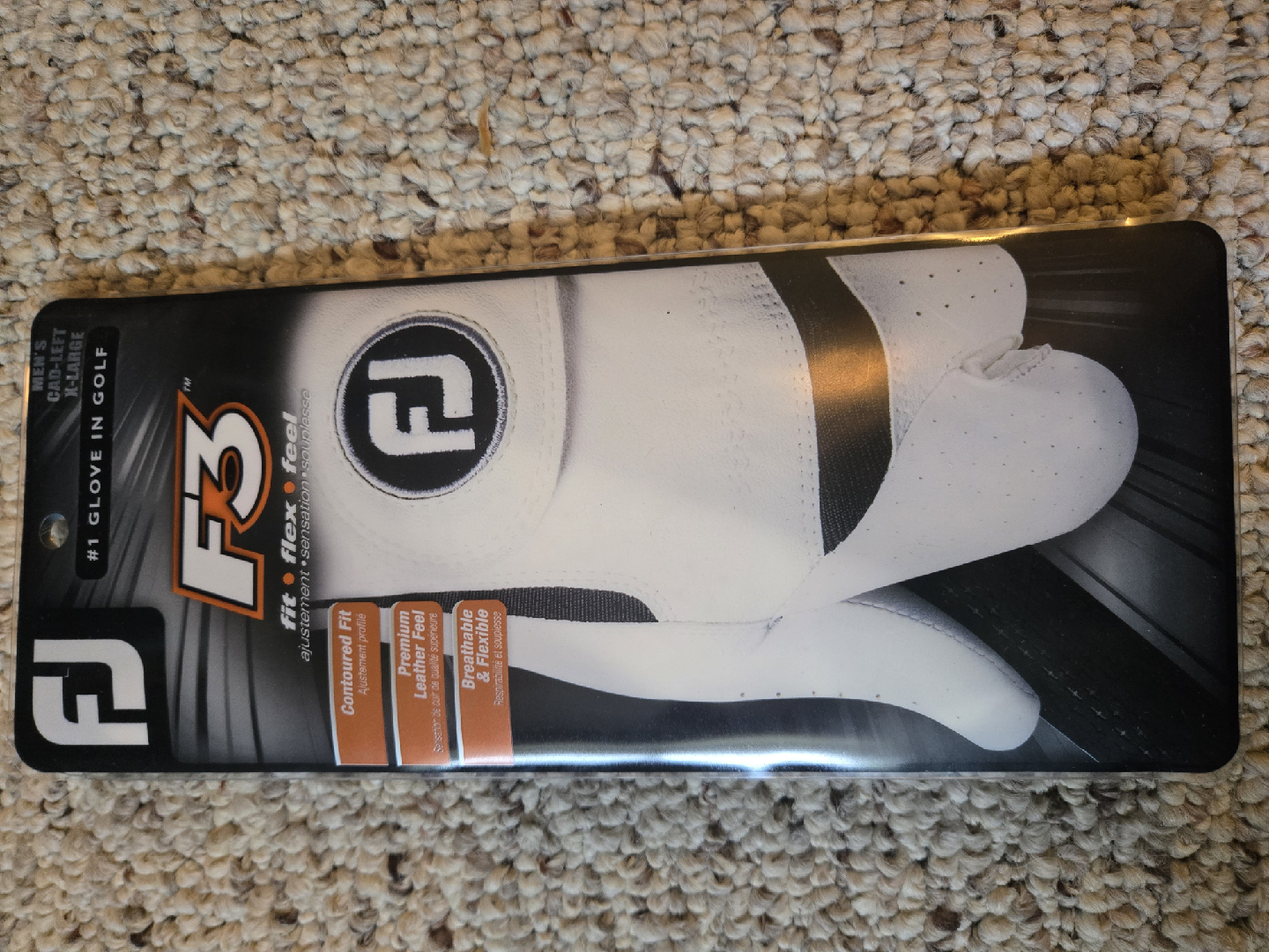 Selling a brand new, in-package FootJoy F3 golf glove in size XL! It's designed for a contoured fit and premium feel, with breathable and flexible materials. Perfect for your next round of golf!