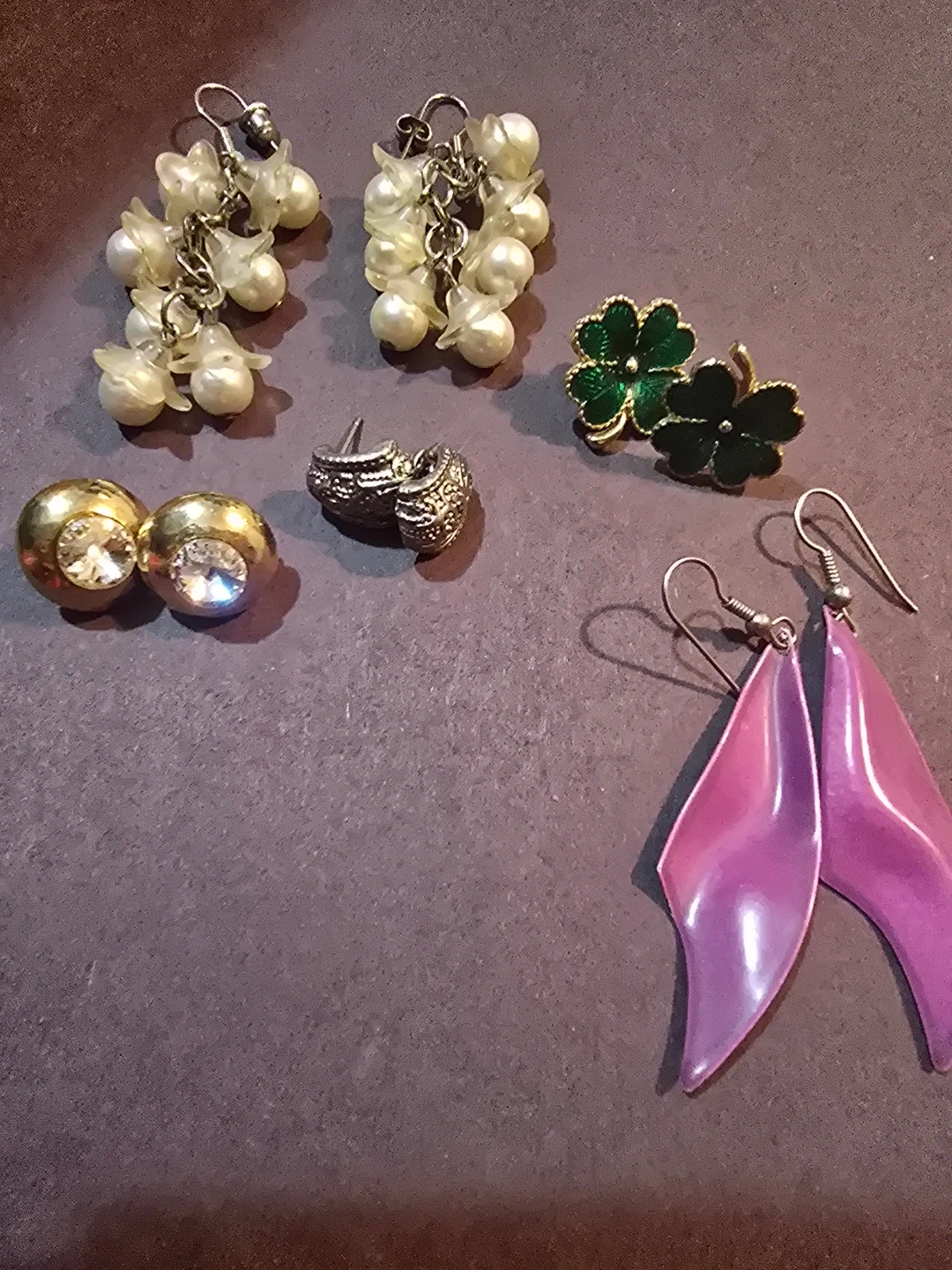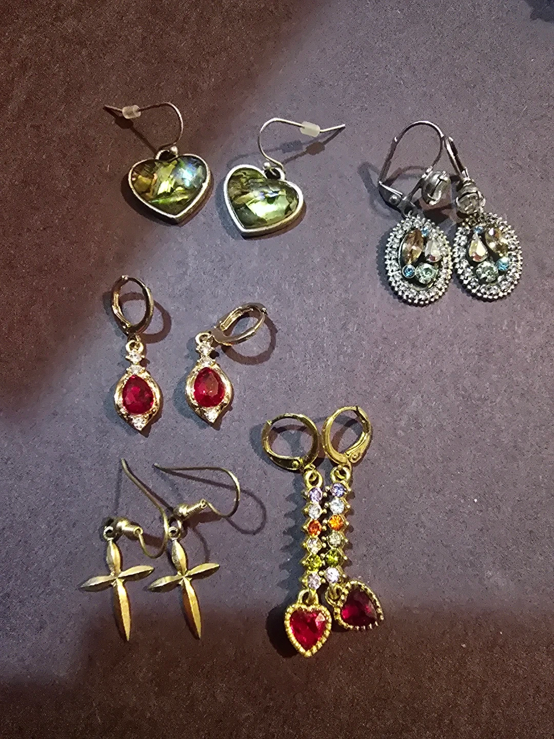 Selling a collection of 10 sets of earrings in various styles. There are heart-shaped earrings, drop earrings with red stones, cross earrings, pearl earrings, and more. They're all in good condition and ready to accessorize your outfits!