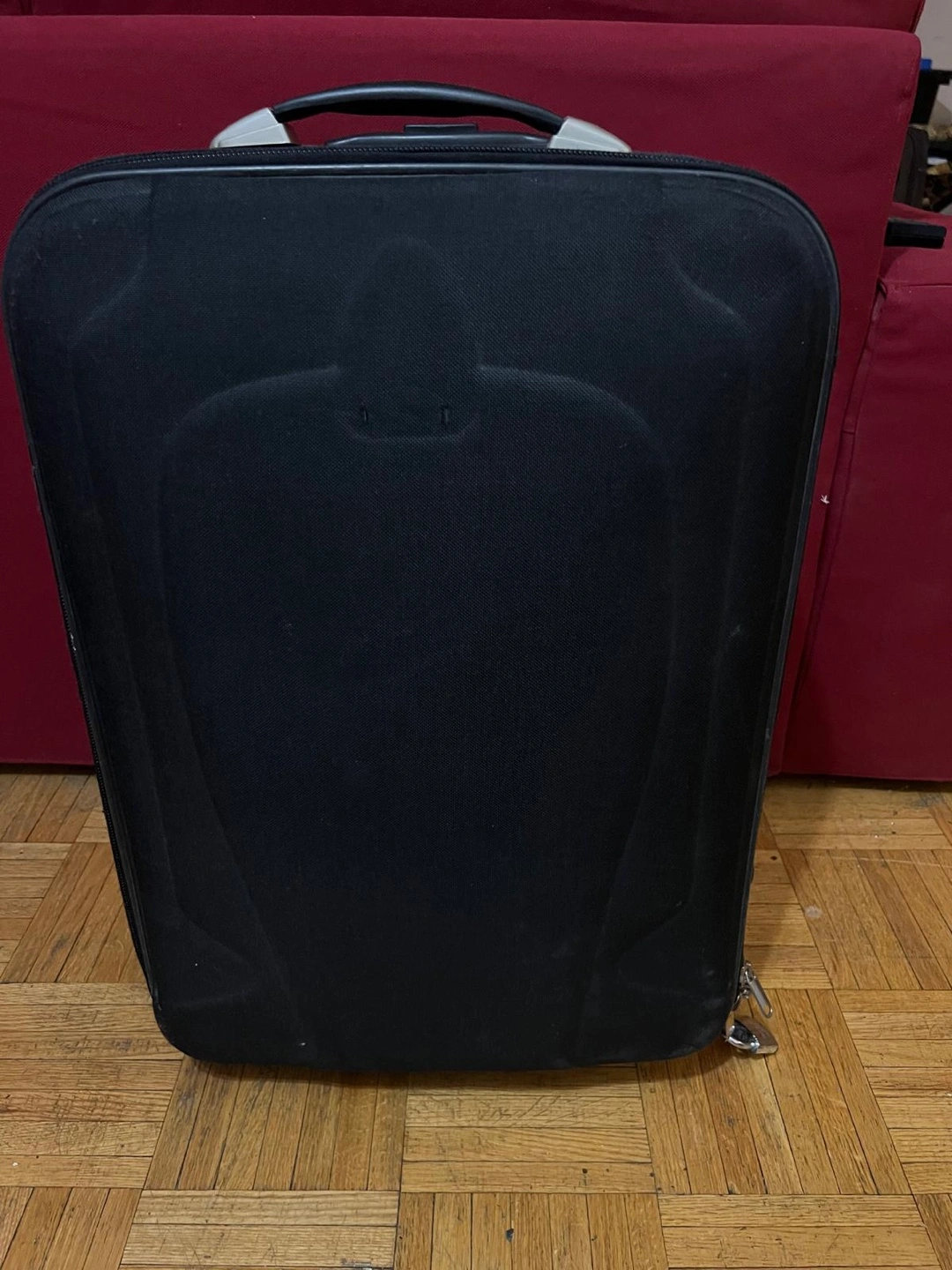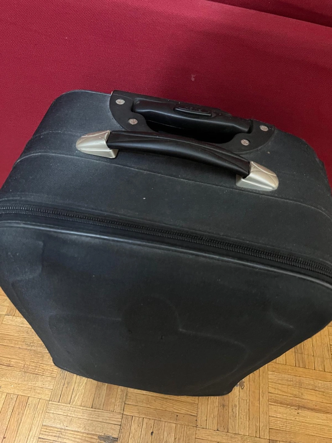 Used black carry-on suitcase. Features two wheels, a top handle, and a zippered closure. Exterior shows some wear. Includes a small exterior pocket.