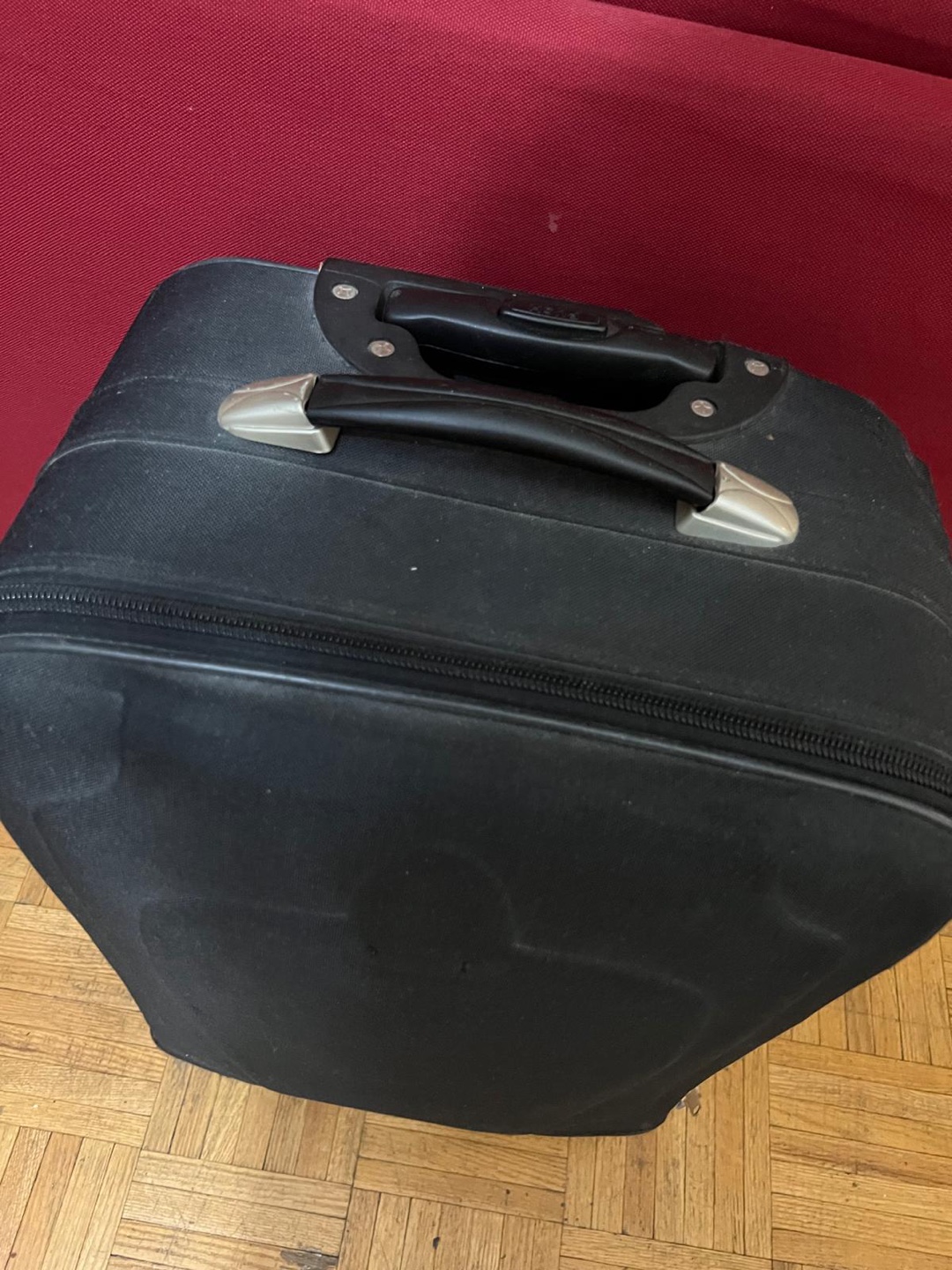 Used black carry-on suitcase. Features two wheels, a top handle, and a zippered closure. Exterior shows some wear. Includes a small exterior pocket.