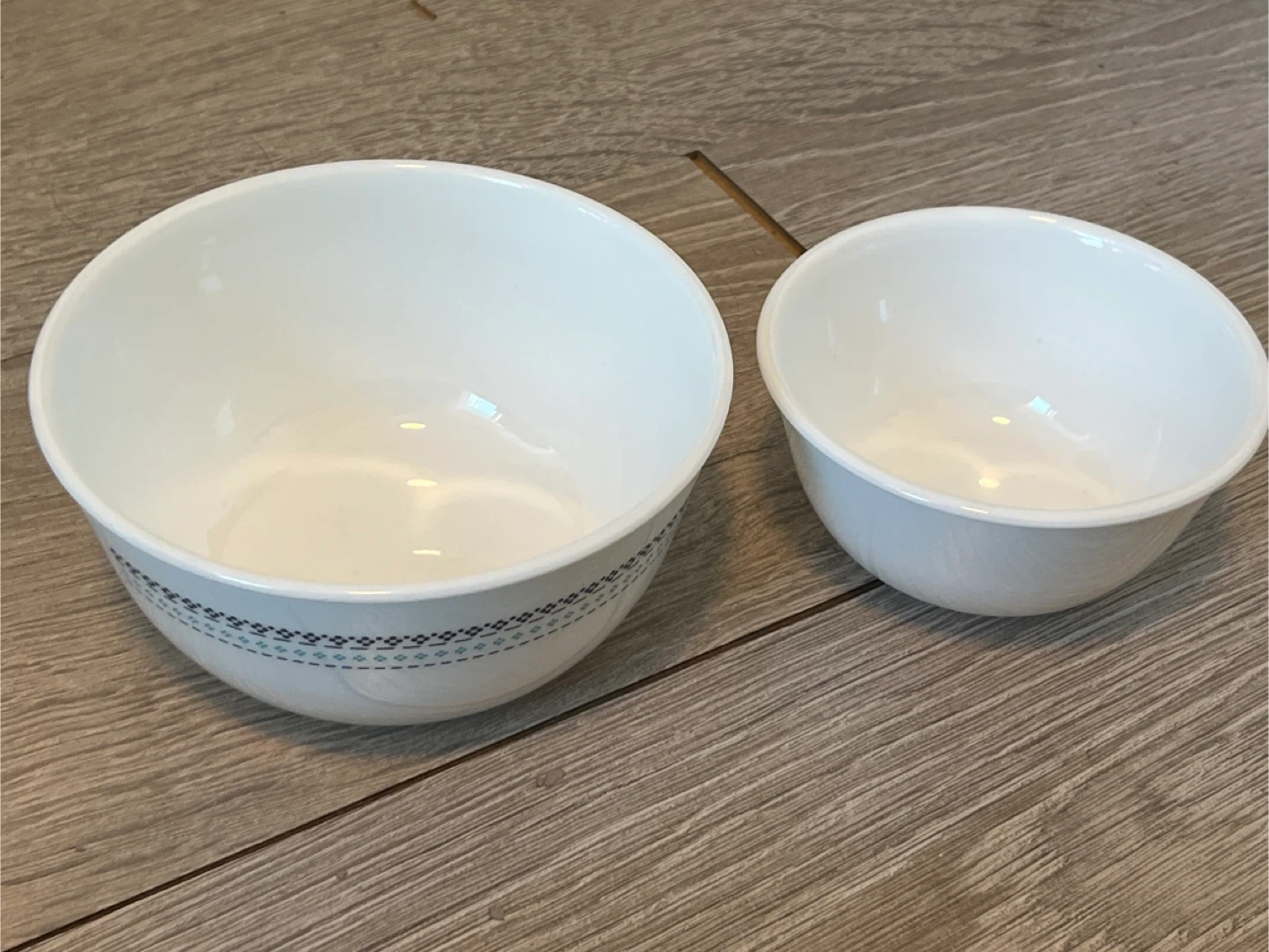 Two white Corelle bowls with a decorative blue and grey pattern around the base. These bowls are made of durable glass material. They're perfect for everyday use, whether serving snacks or main dishes.