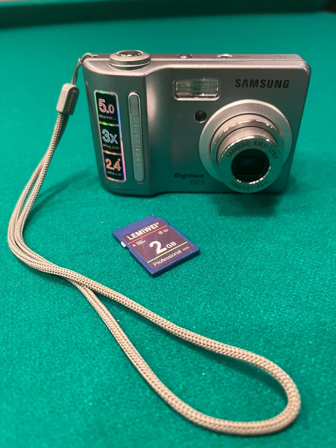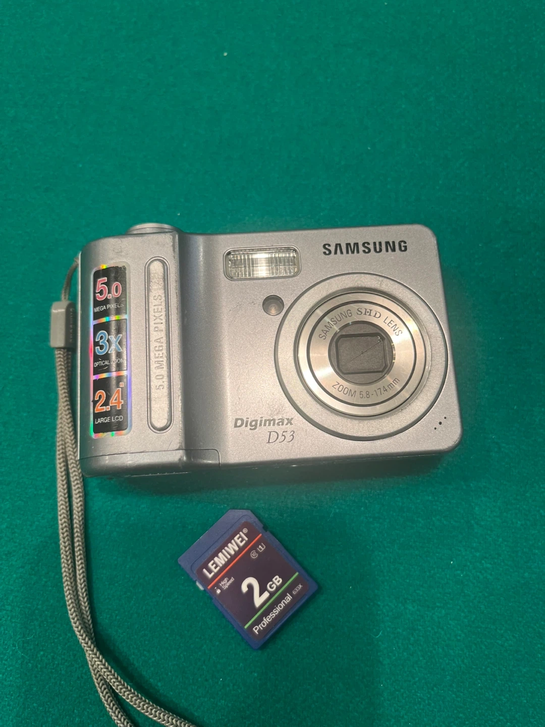 Samsung Digimax D53 digital camera. Features 5.0 mega pixels, 3x optical zoom and 3x digital zoom. A 2GB memory card is included. LCD screen is 2.4 inches.