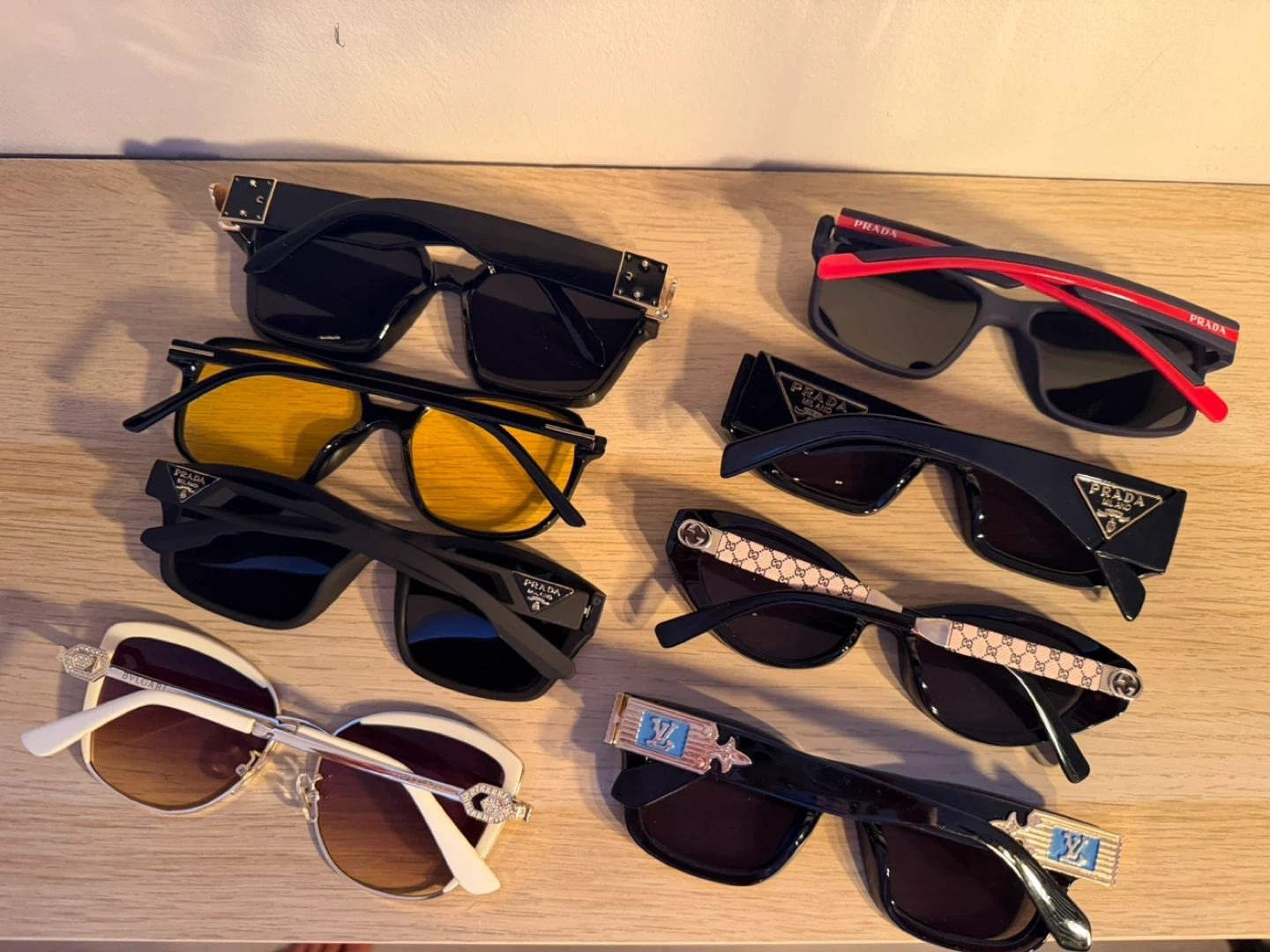 Variety of stylish sunglasses from top brands like Prada, Gucci, and Louis Vuitton. Includes polarized and fashion-forward styles. Perfect for adding a chic touch to any outfit!