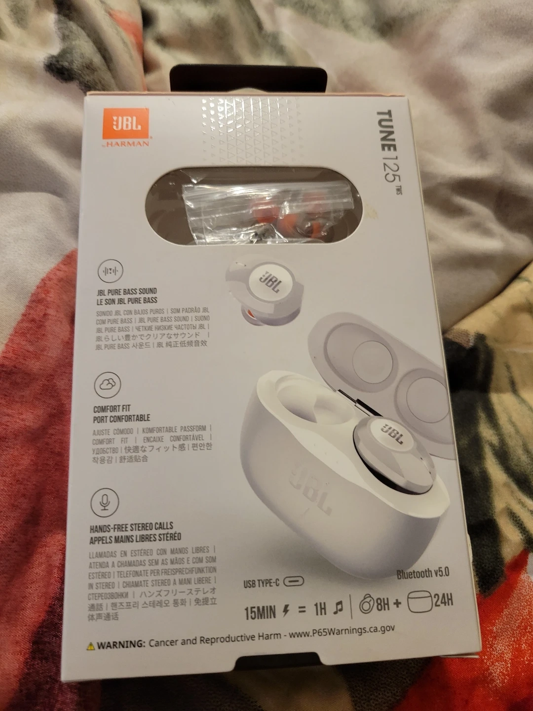 These are white JBL Tune 125 TWS wireless earbuds. They offer pure bass sound and zero cables. Includes USB Type-C charging cable and multiple ear tip sizes. Bluetooth v5.0 connectivity.