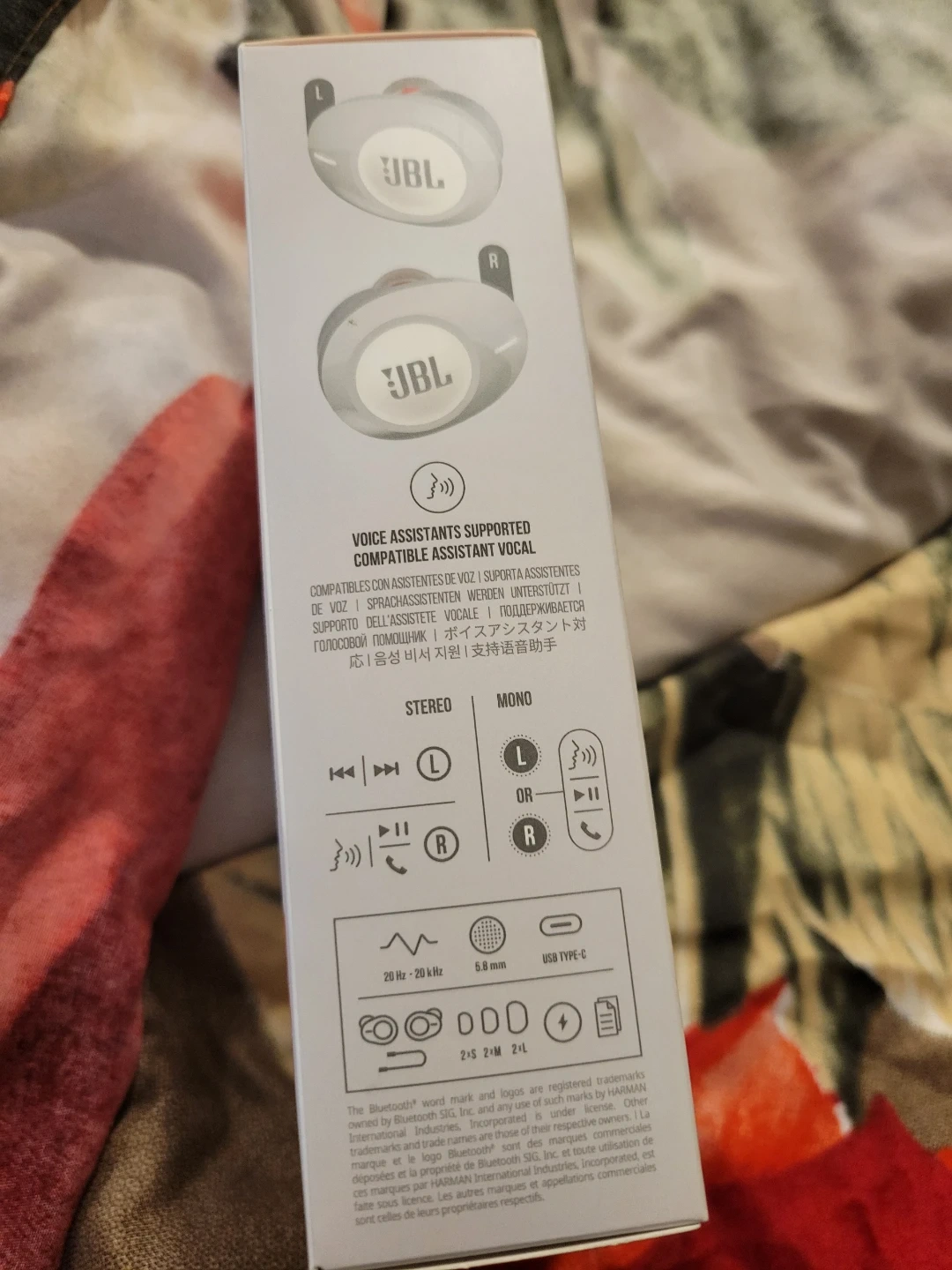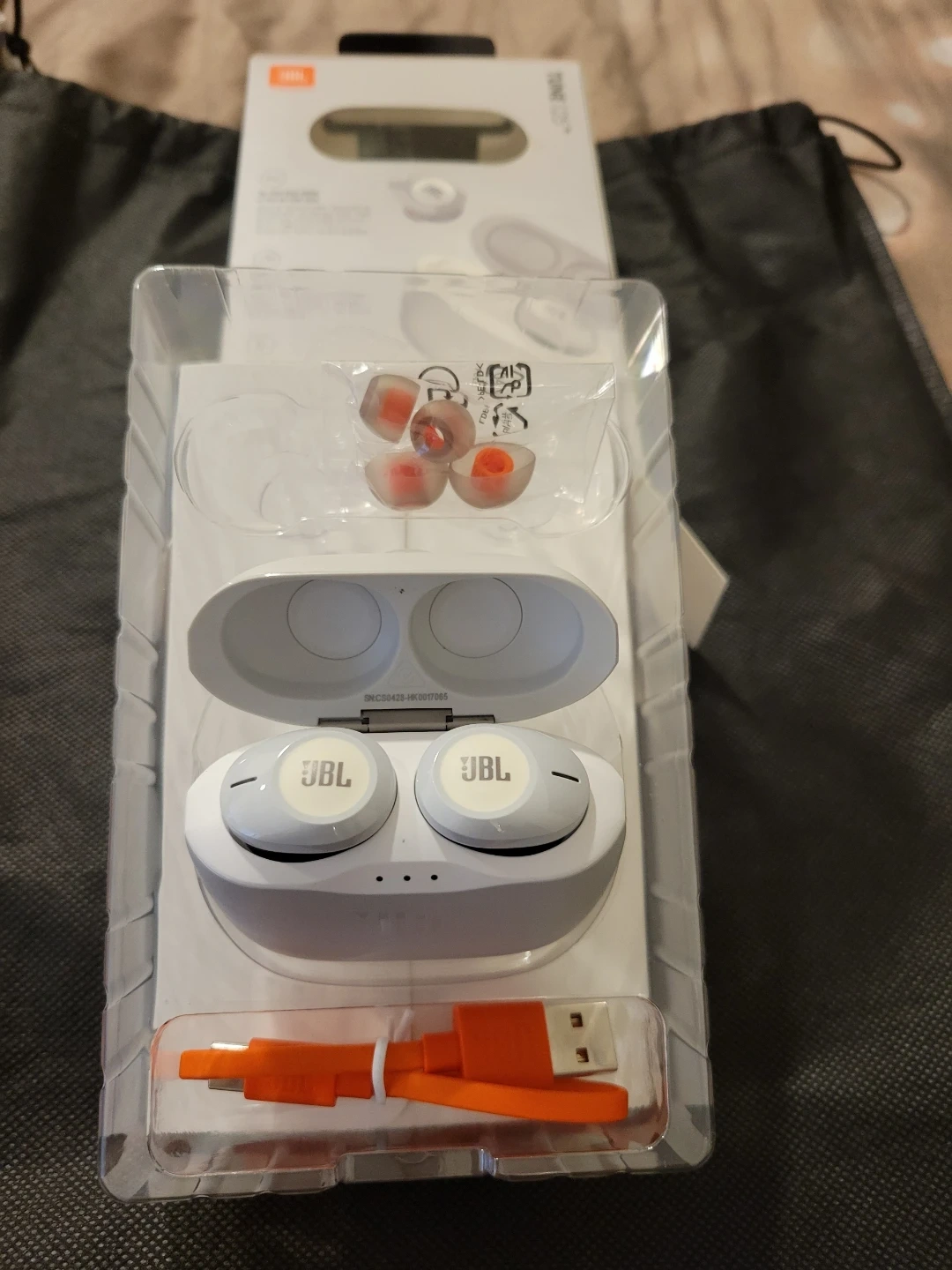 These are white JBL Tune 125 TWS wireless earbuds. They offer pure bass sound and zero cables. Includes USB Type-C charging cable and multiple ear tip sizes. Bluetooth v5.0 connectivity.