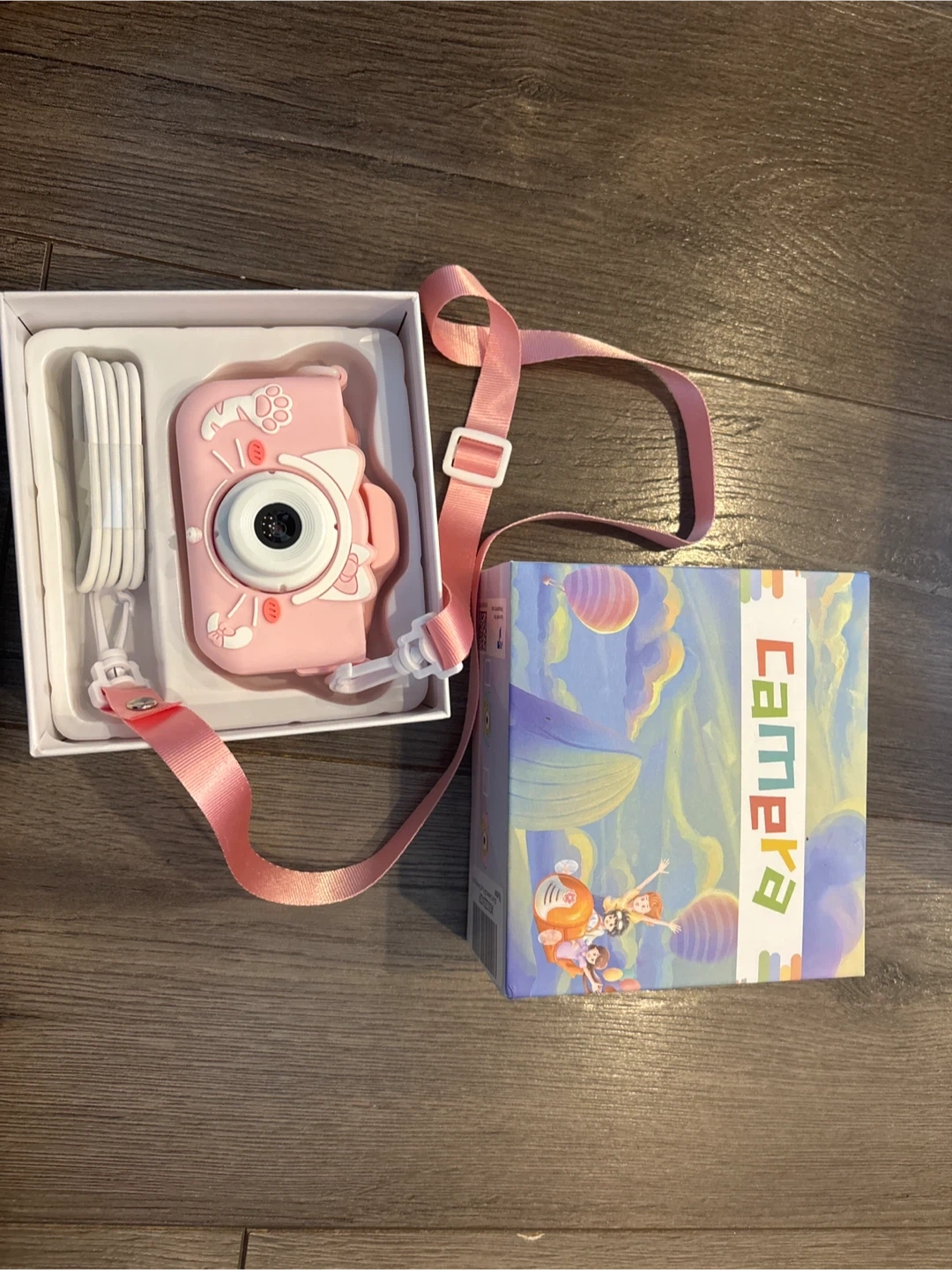 New! This is a pink digital camera designed for kids. It's shaped like a cute cat face and comes with a pink strap for easy carrying. The camera includes a charging cable and its original box. This compact camera is perfect for little ones to start exploring photography!