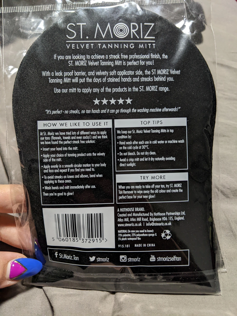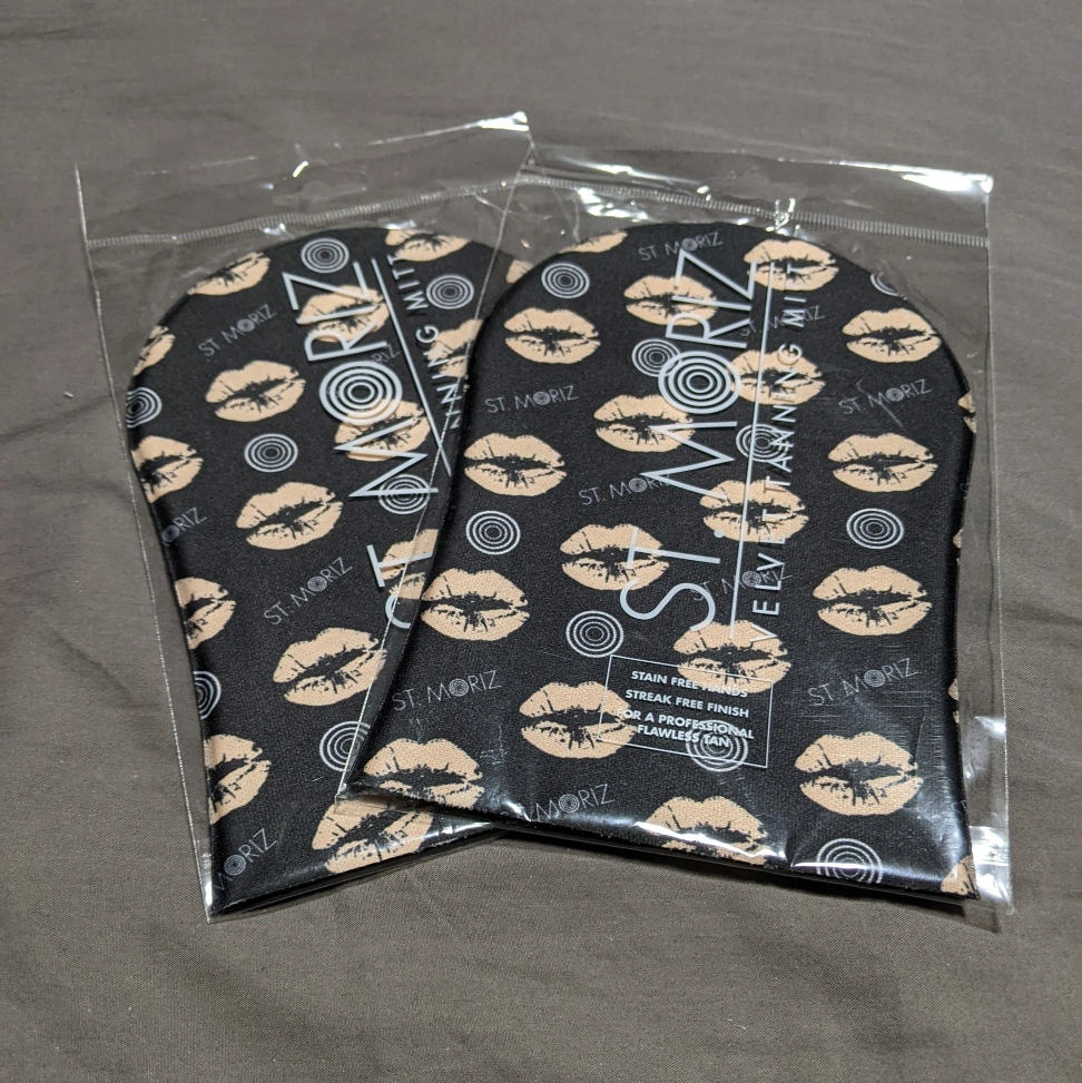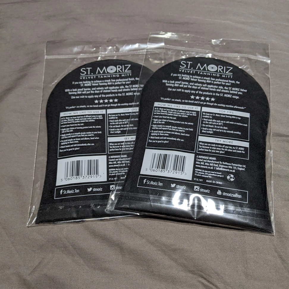 I have a pair of velvet tanning mitts from the brand St. Moriz. Purchased a few years ago when I was experimenting with self tanners but these were never used - both are still sealed in the packaging.