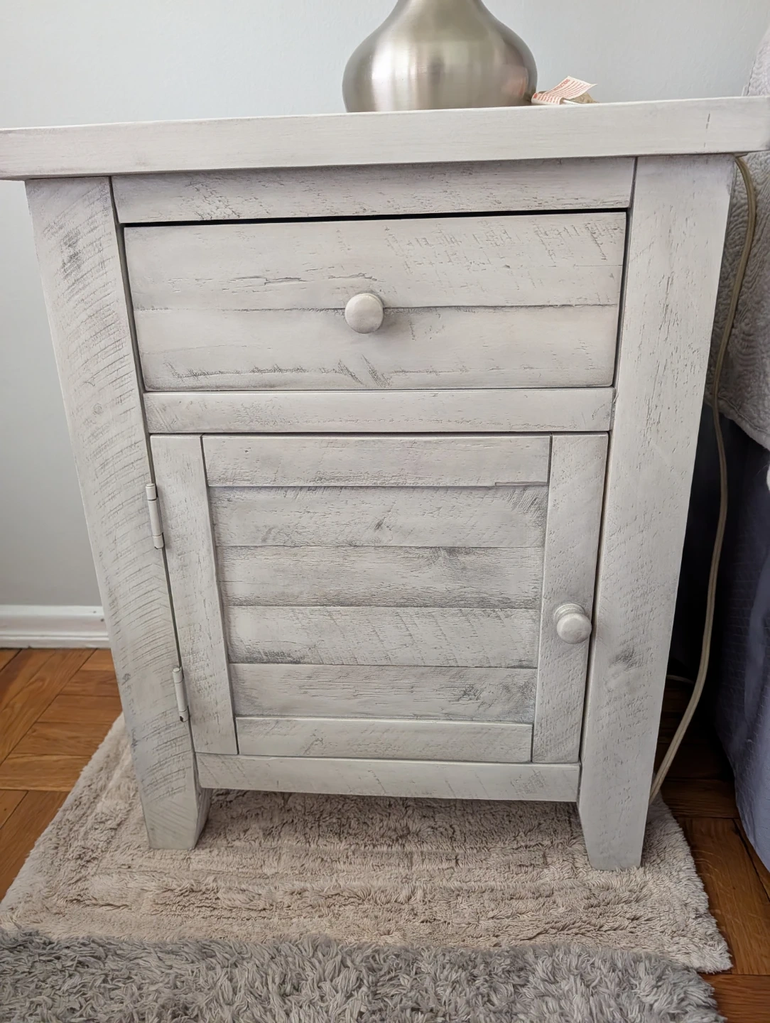 These 2 nightstands feature a rustic white/grey distressed wood finish. It includes one drawer and a cabinet for storage. There is also a power cord for an outlet and 2 USB ports. These are a set and are like new. See measurements in the photos. I paid $150 each at Home Sense so you are getting 2 for the price of 1.