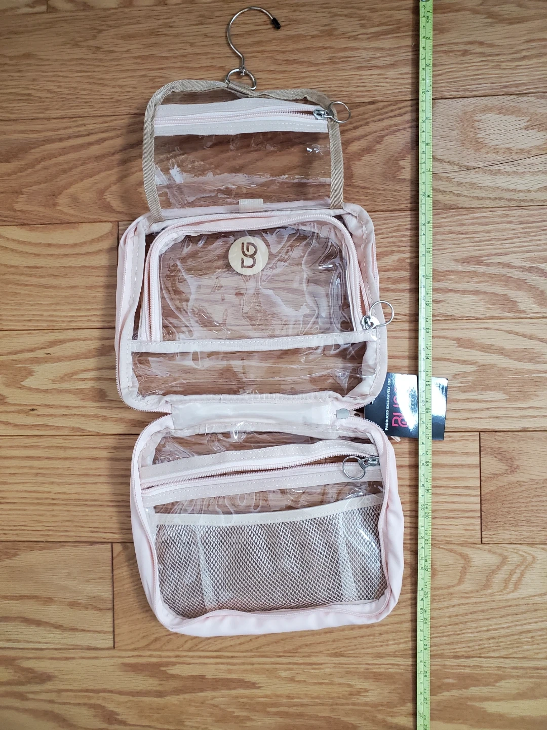 Bliss travel toiletry bag in pink. It's made of fabric and clear plastic with multiple compartments. Features a hook for hanging, perfect for organizing your essentials at home or on the go!