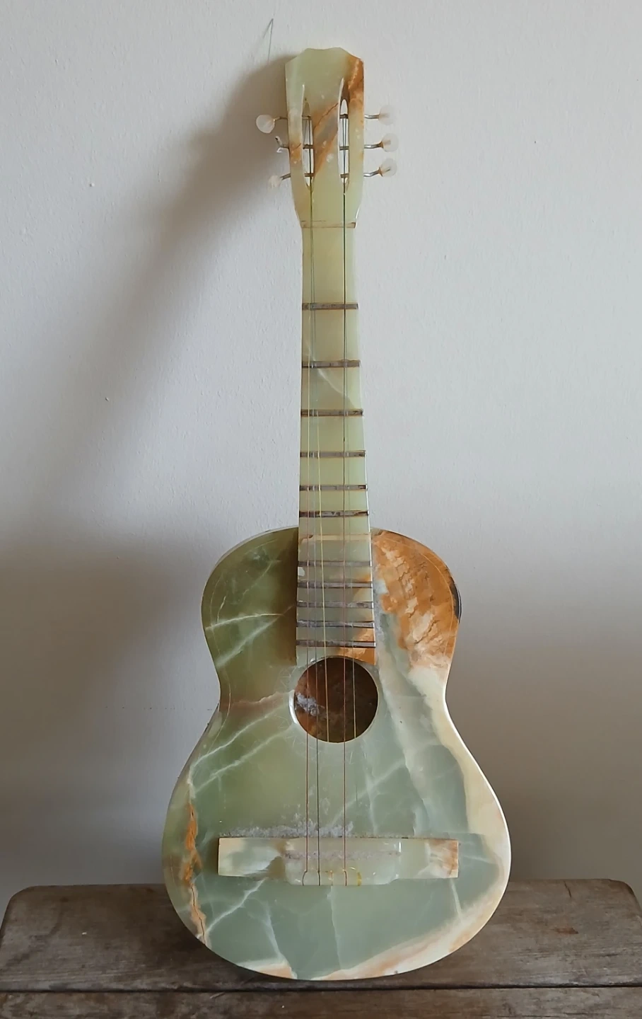 Unique decorative guitar crafted from green and brown onyx. Features intricate marbling and a polished finish. It's a beautiful statement piece for home decor. Perfect for display!