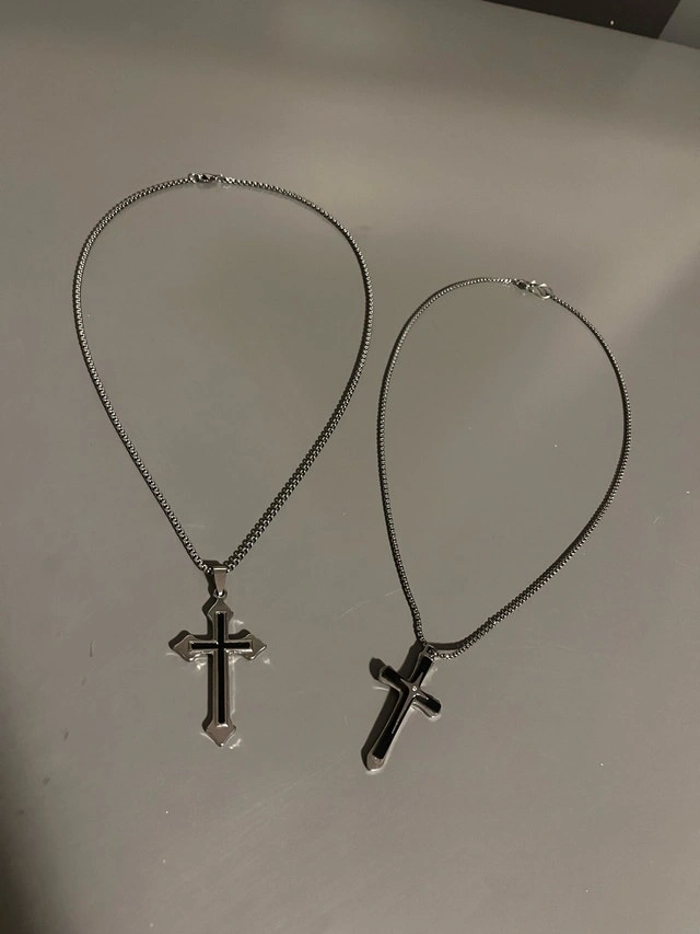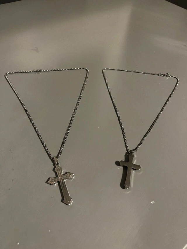 These are basically brand new as they were never worn, just sat in a jewelry box. Both are silver colour with cross pendants. One is 39 cm, the other is 41 cm. Crosses can come off if that’s what you want. Looking for $30 each.