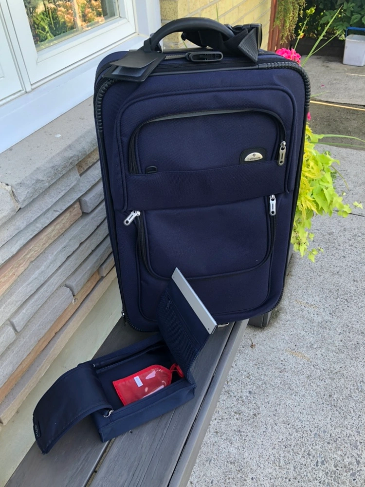 Size 23 X 14 X 8, Cleaned Blue carry-on suitcase on wheels with a zippered front pocket. The suitcase has a mesh top pocket, zippered bottom pocket, and an elastic strap for holding clothing in place. The suitcase also has a handle on the top, a handle on the side, and a retractable handle. The suitcase has a pocket in the front which folds down to reveal a zippered compartment. The zipper compartment has a zippered pocket inside. It also comes with small blue personal toiletries tote, and the suitcase has new travel name tag