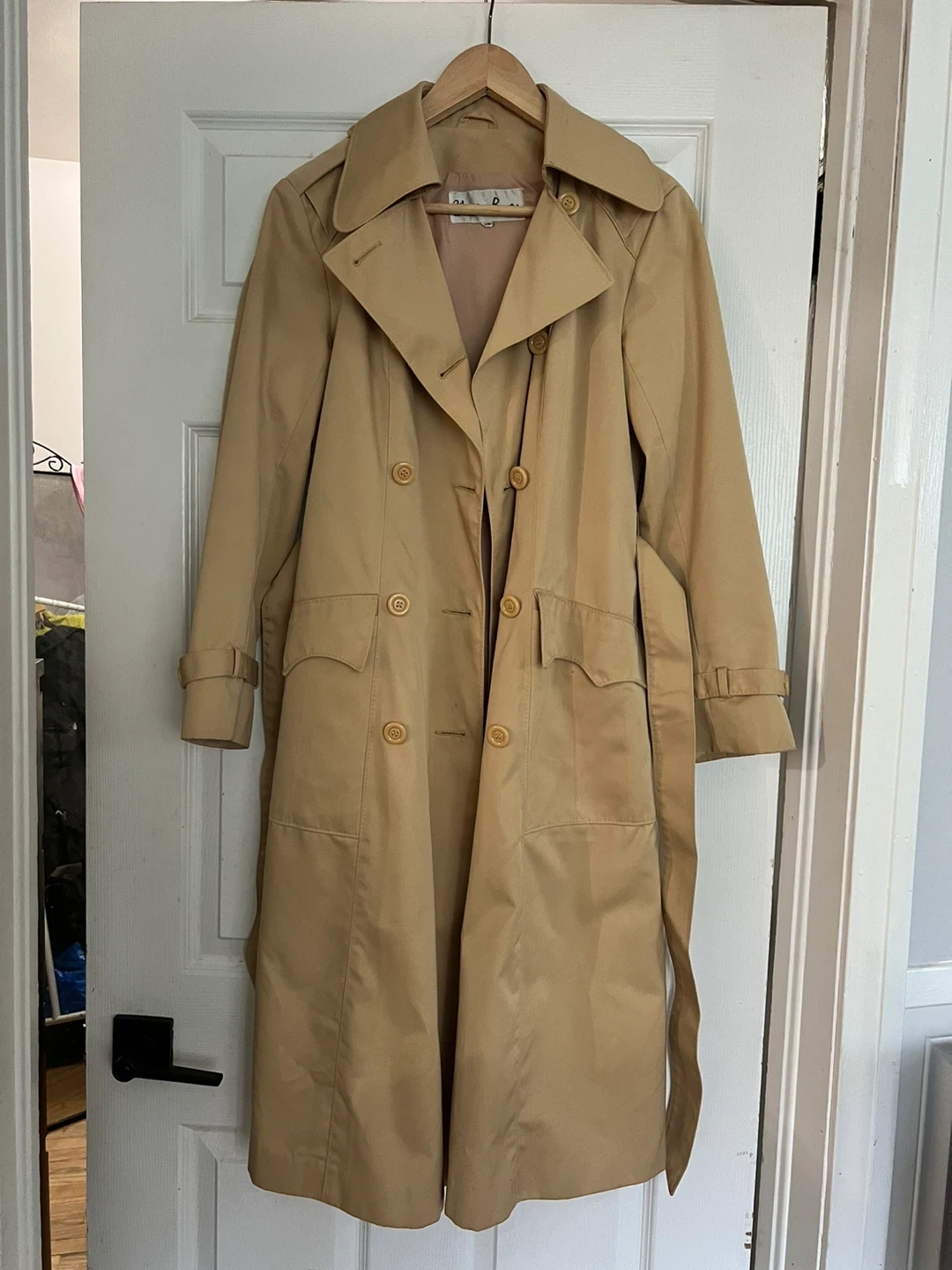 Here's a classic vintage trench coat in a lovely tan colour. It features a double-breasted design with multiple buttons and a belted waist. Perfect for adding a touch of timeless style to your wardrobe! Size 12.