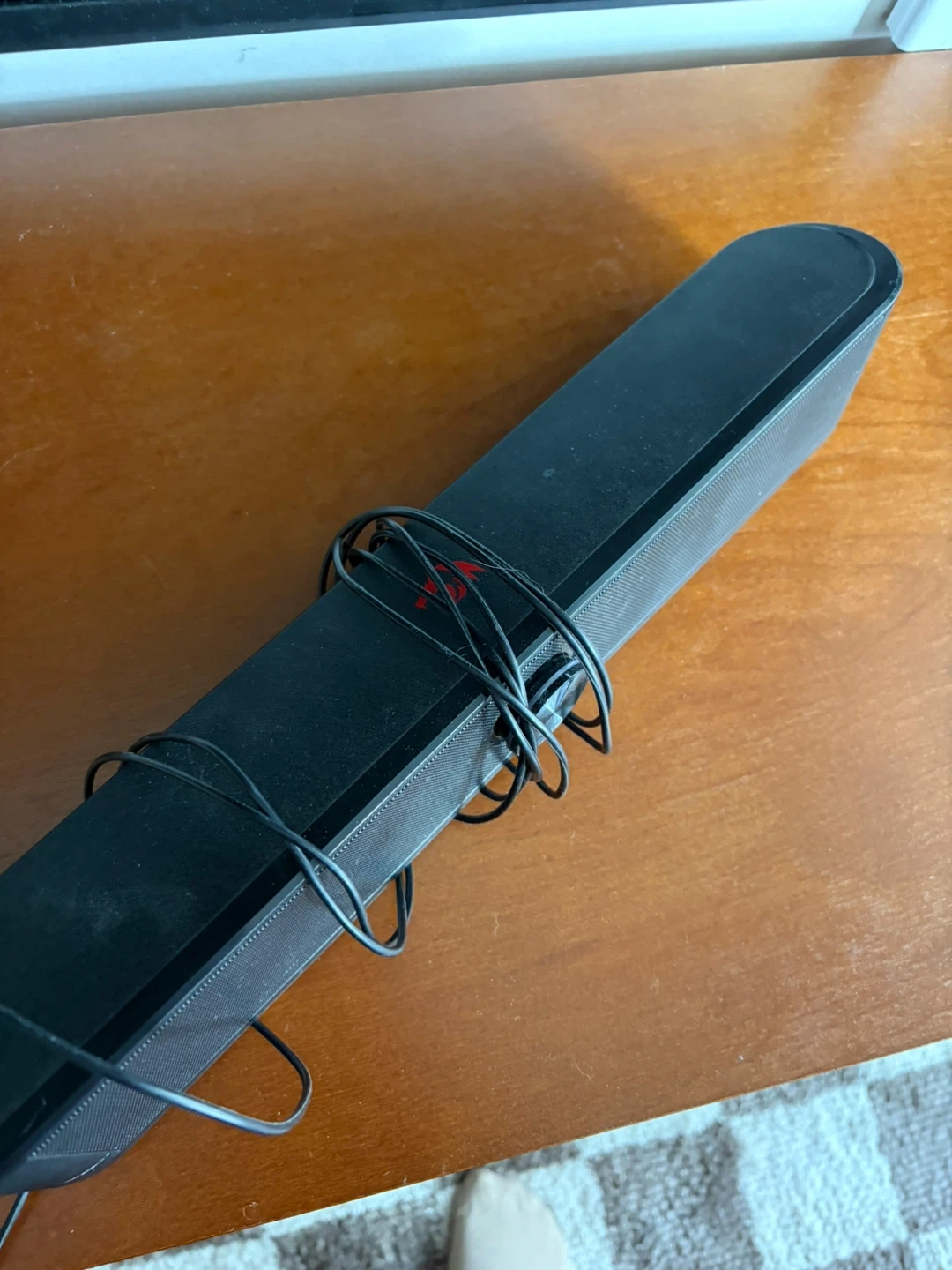 This Redragon computer speaker bar delivers vibrant RGB lighting with audio-light sync. It's USB powered and features a volume knob for easy control. A 3.5mm cable is included for connectivity. It’s in good condition but needs a good dusting.