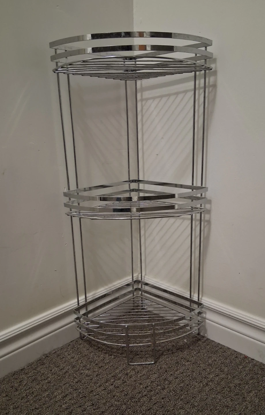 A three-tiered chrome corner shelf unit. It's made of metal and has a silver finish. This unit is great for organizing items in a bathroom or shower!