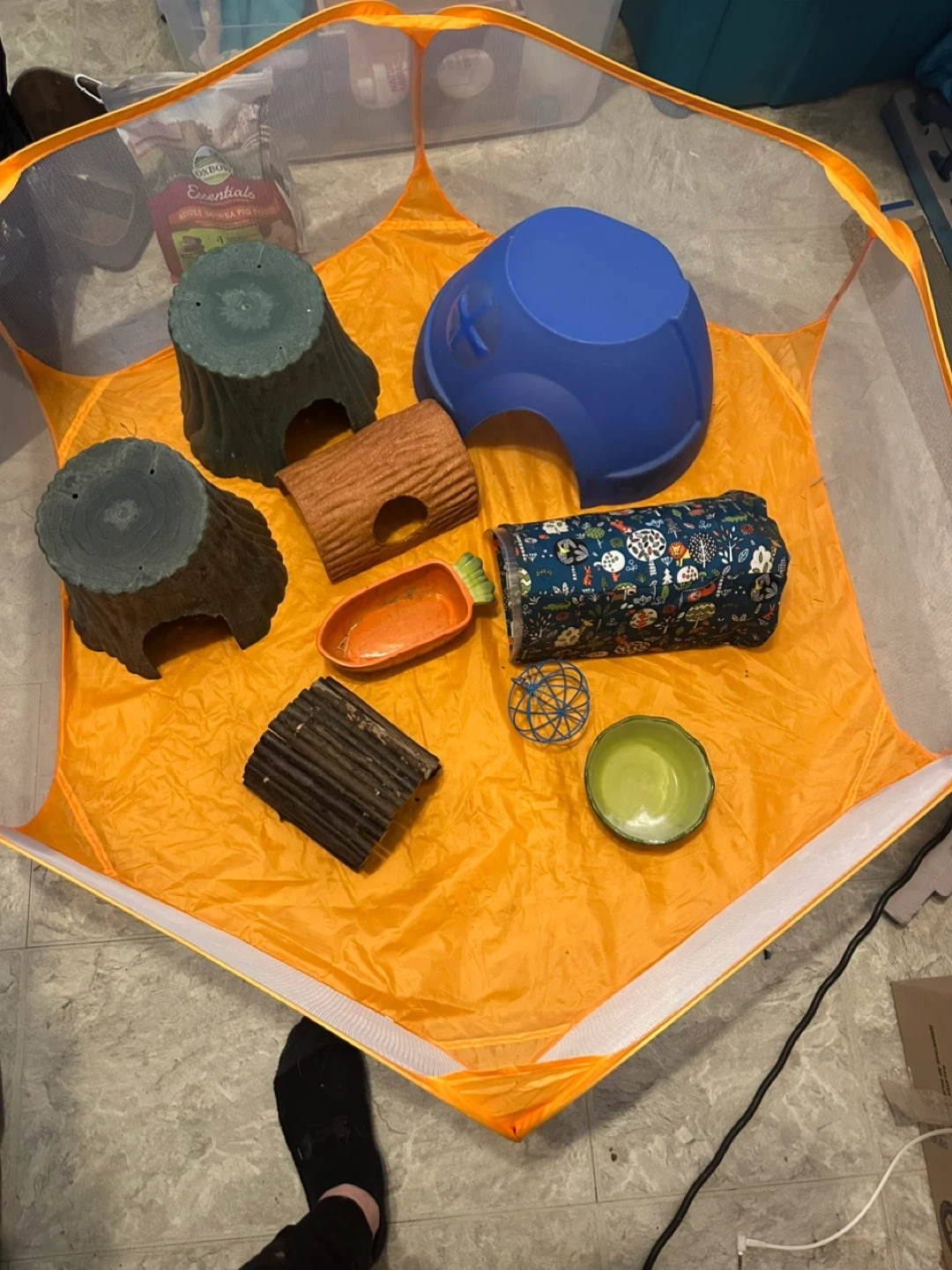 Orange collapsible playpen for small animals. Includes a blue hideout, two tree stump houses, a wooden log tunnel, a carrot-shaped food dish, a small ball, and a green bowl. It's great for giving your small pet some extra room to explore!