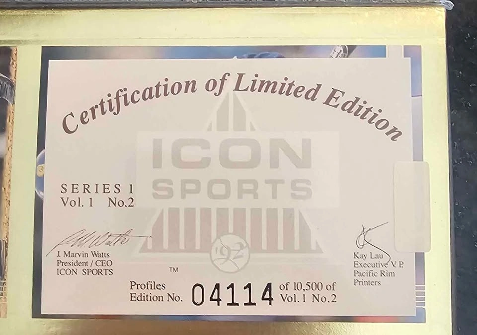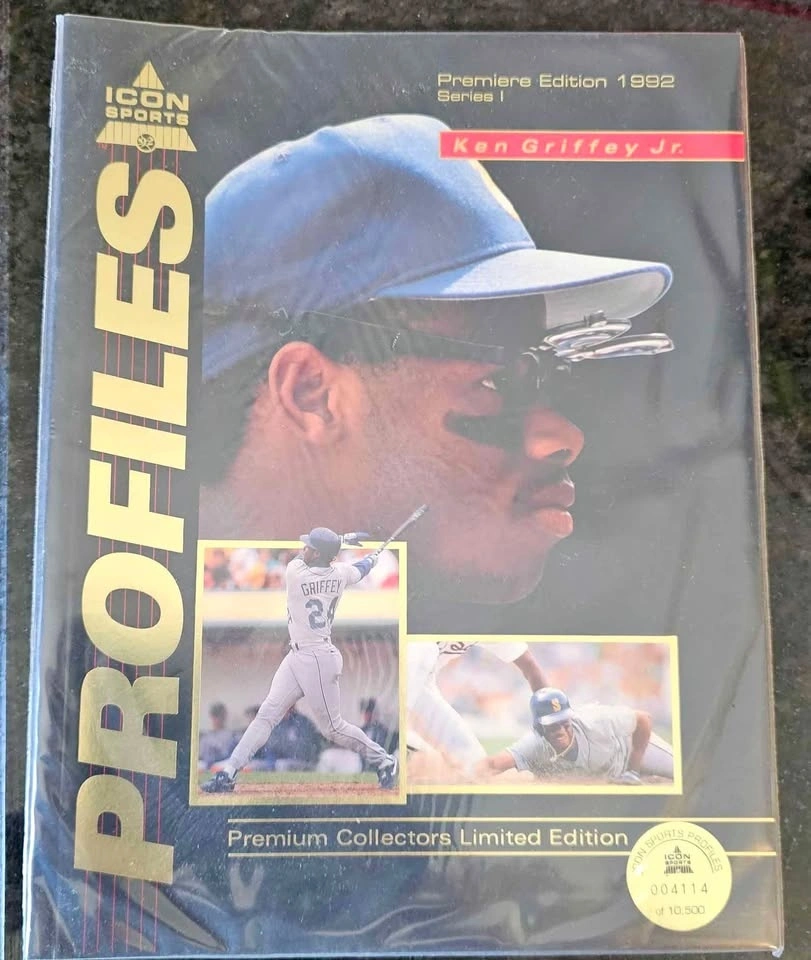 For sale is an original factory sealed Icon Sports Profiles Magazine of Ken Griffey Jr. This is a premium Gold embossed Collectors edition issue. Volume 1 Series 1 Number 2. Comes with certification and serial number. Uncut sheet of 9 cards on back cover. From original box in Mint condition.