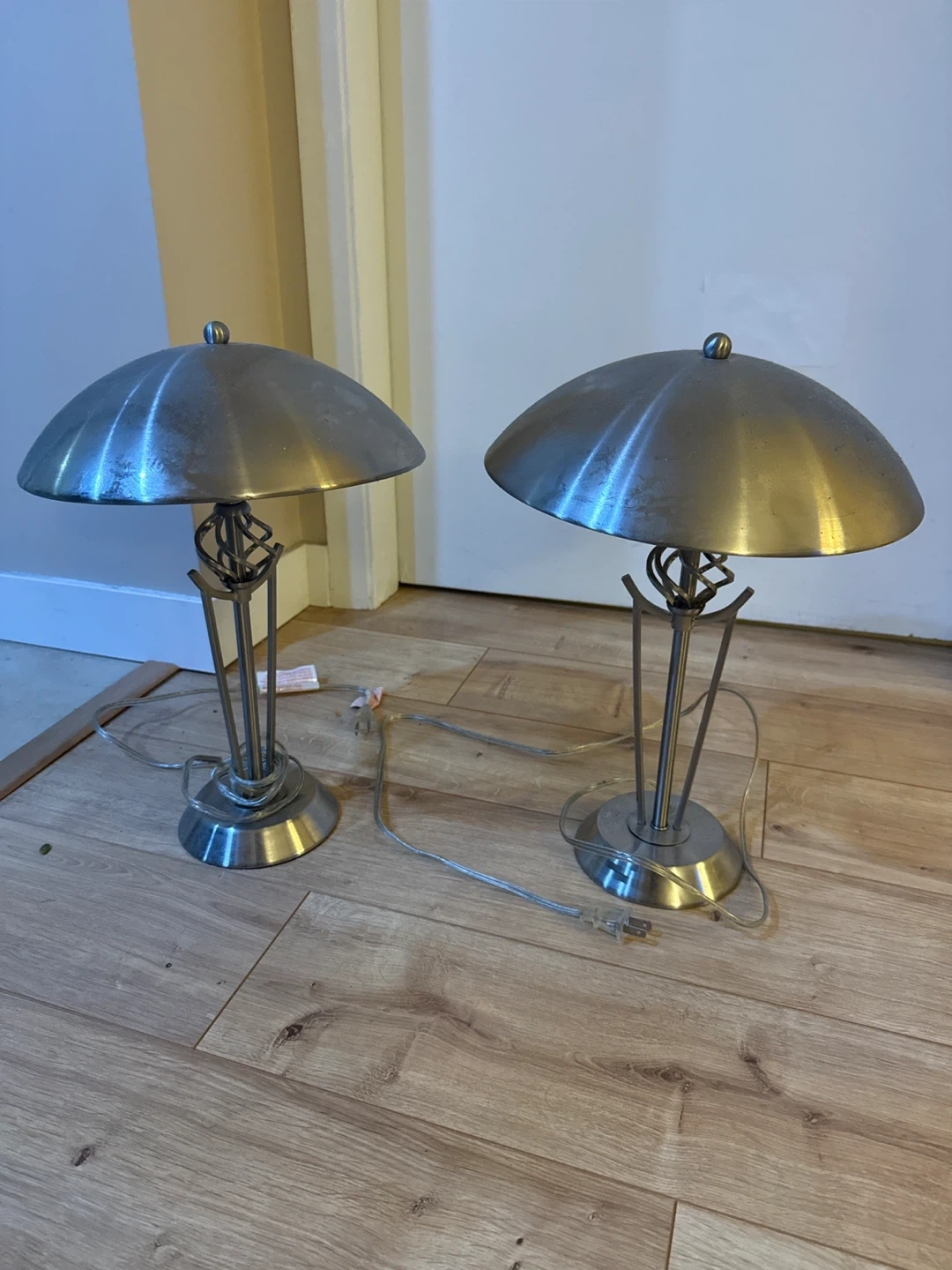 Here's a set of two brushed metal table lamps. Each lamp features a unique twisted metal stem and a dome-shaped shade. They're sure to add a stylish touch to any room!