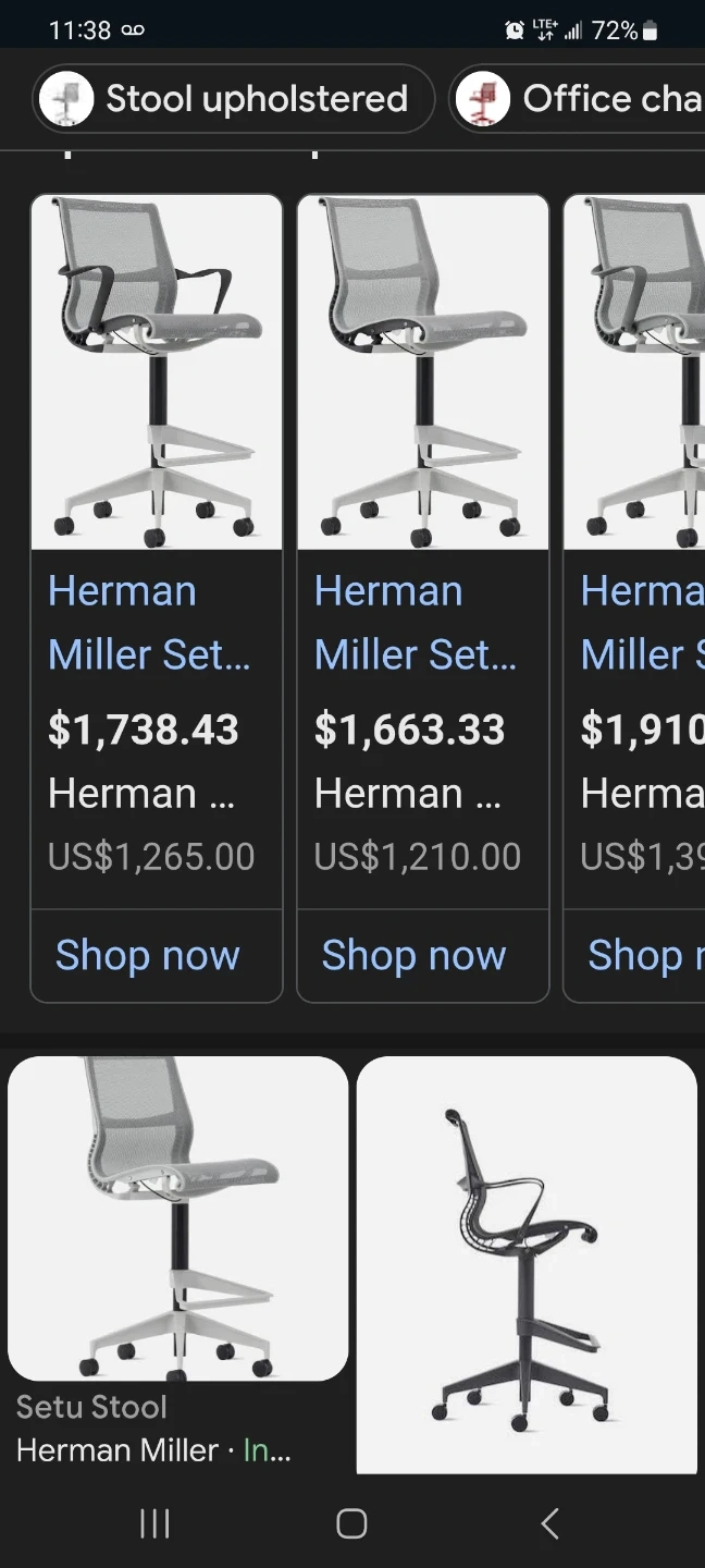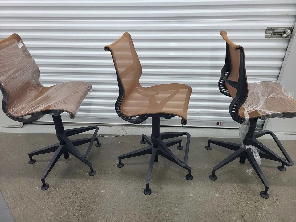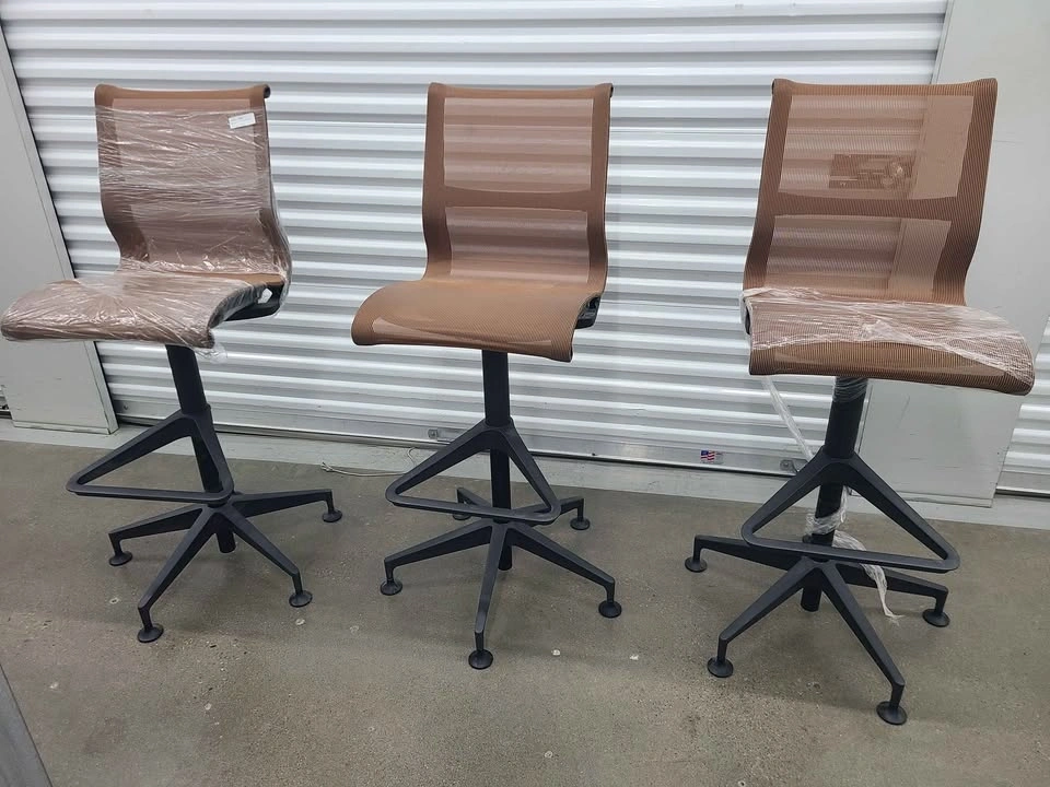 - 1 pre-owned at $200. These are Herman Miller Setu armless stools, high-end office furniture. They feature a graphite tone base with a footrest and spice brown mesh. Designed by Studio 7.5, the 'Kinematic Spine' supports movement without complex adjustments. The Lyris 2 suspension material distributes weight evenly and provides aeration. Pickup in Downtown Toronto near Adelaide Street.