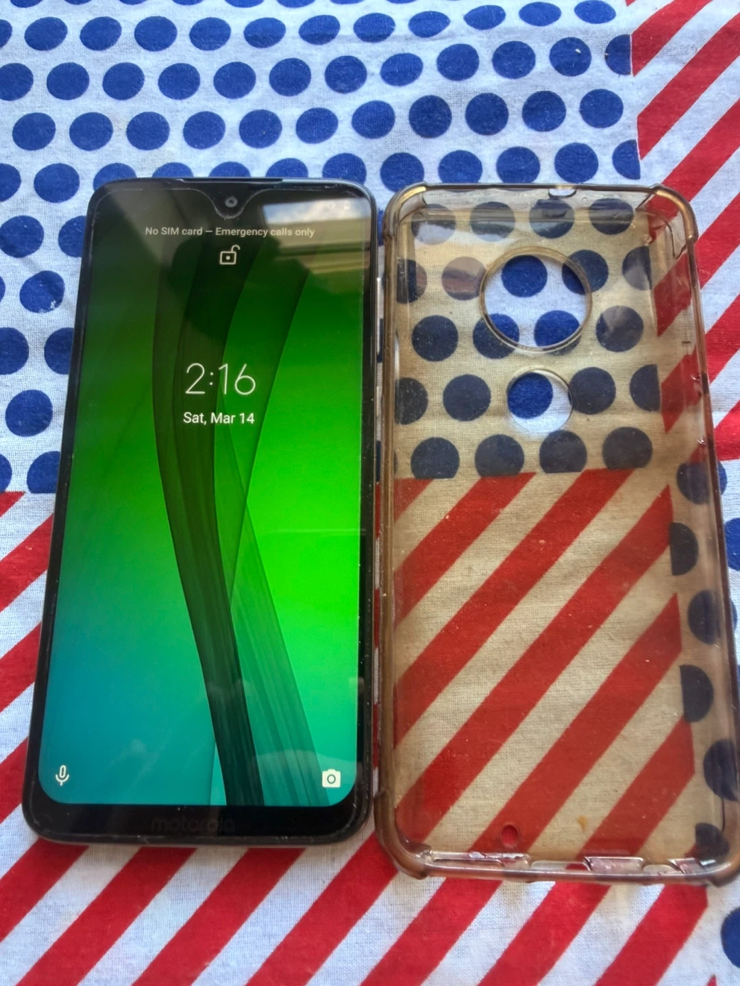 Selling a white Motorola Moto G7 Play smartphone. It's a reliable device for everyday use. Includes a clear protective case with an American flag design. Phone model XT1952-1.