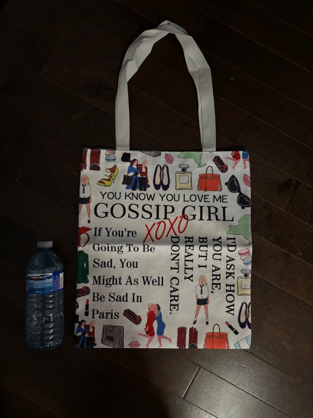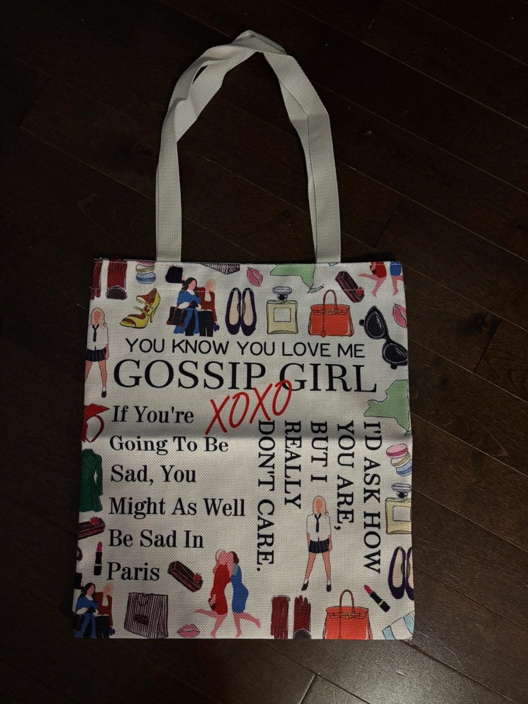 Cute reusable tote bag. Features Gossip Girl theme with iconic quotes and imagery. White canvas material. Two handles for carrying.