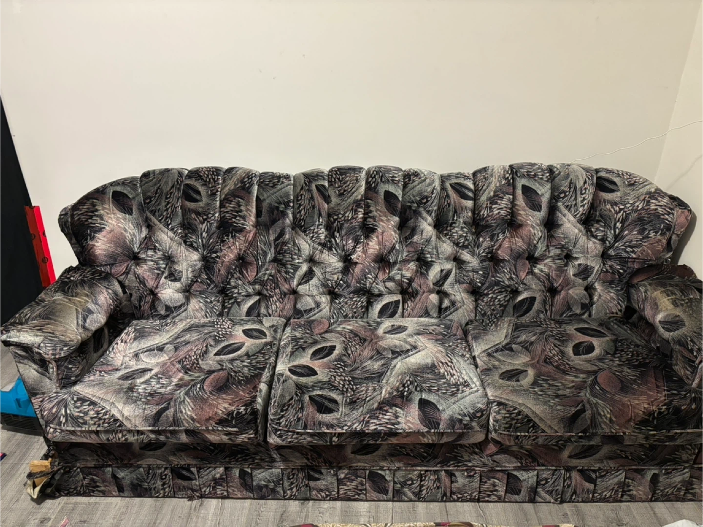 This is a tufted sofa with a patterned fabric. It has a classic design with button tufting along the back and seat cushions. The fabric features a repeating feather or leaf motif in various shades of grey, purple, and beige. It appears to be a three-seater couch. This sofa would add a vintage touch to a living space.