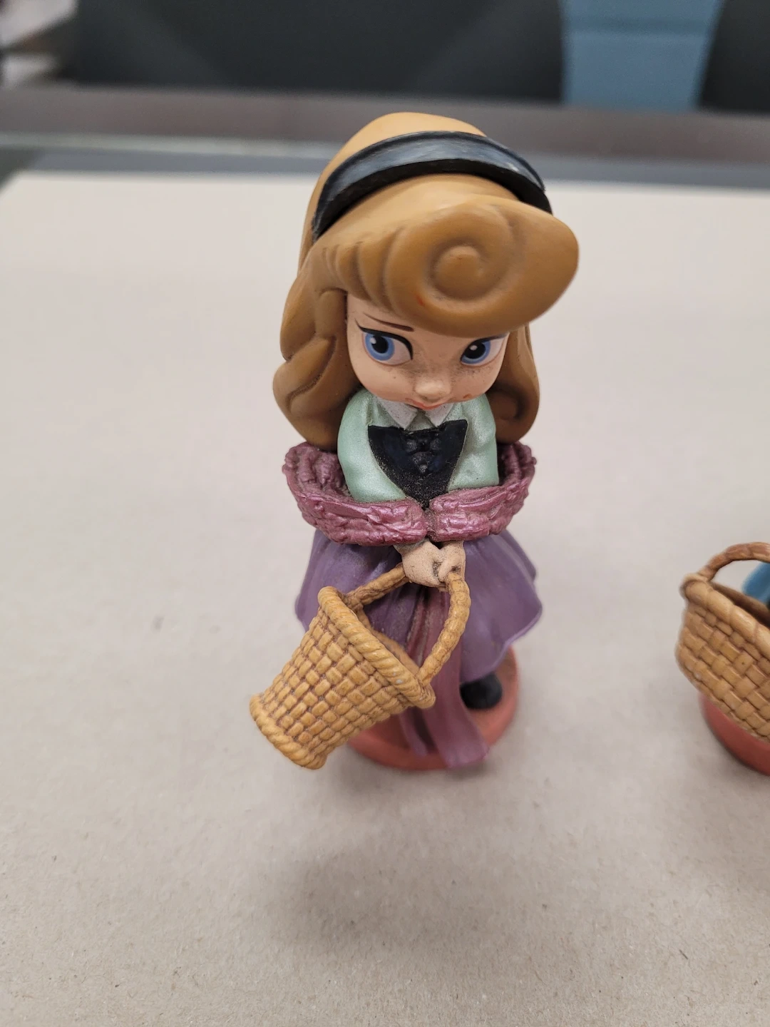 This is a Disney Aurora figurine holding a small woven basket. The figurine is detailed and depicts the character in her classic gown. It's made of durable material and stands on a pink base. This would be a sweet addition to a collection!
